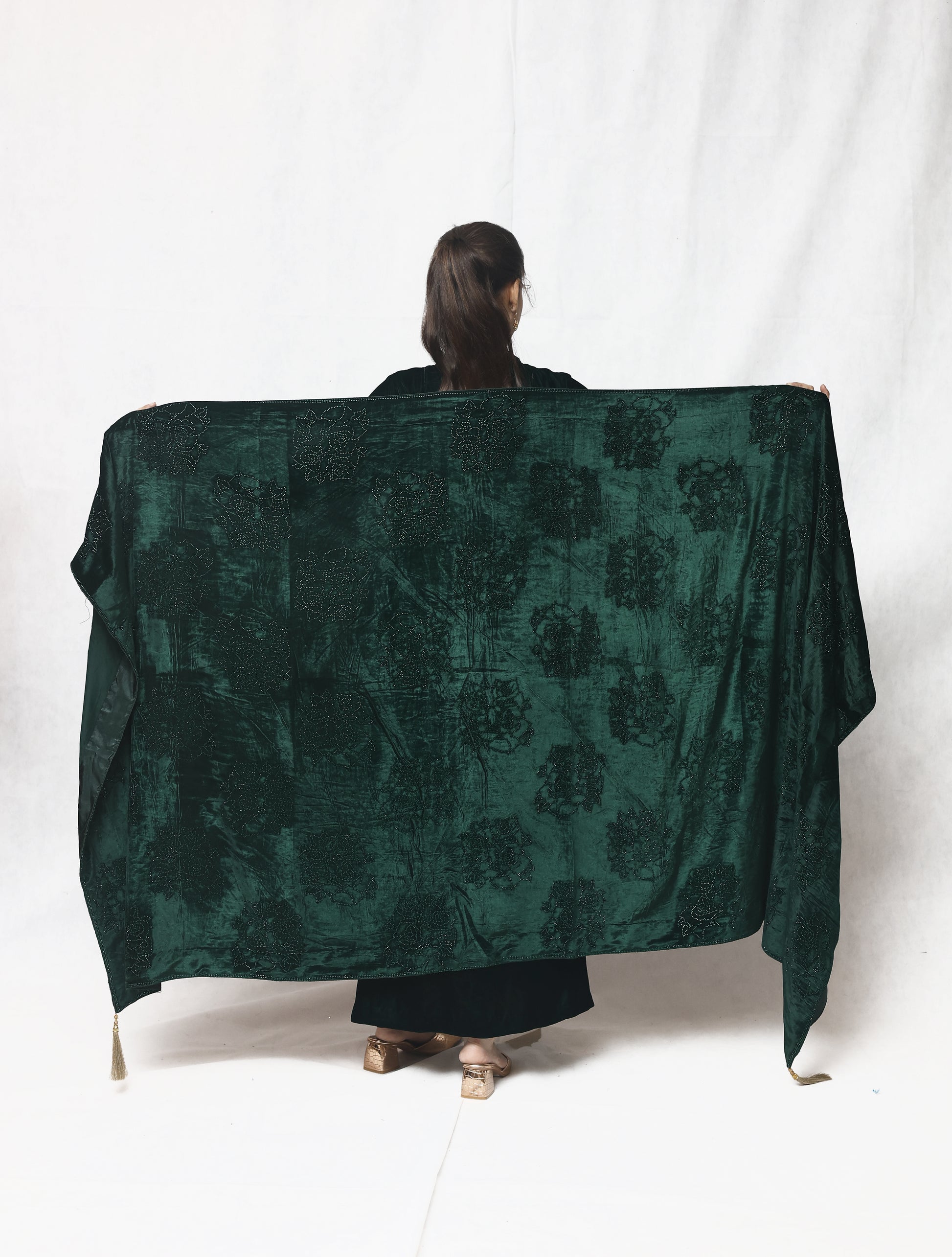 Description: A luxuriously soft velvet shawl adorned with same studded motifs and finished with elegant tassels — perfect for festive and formal wear.