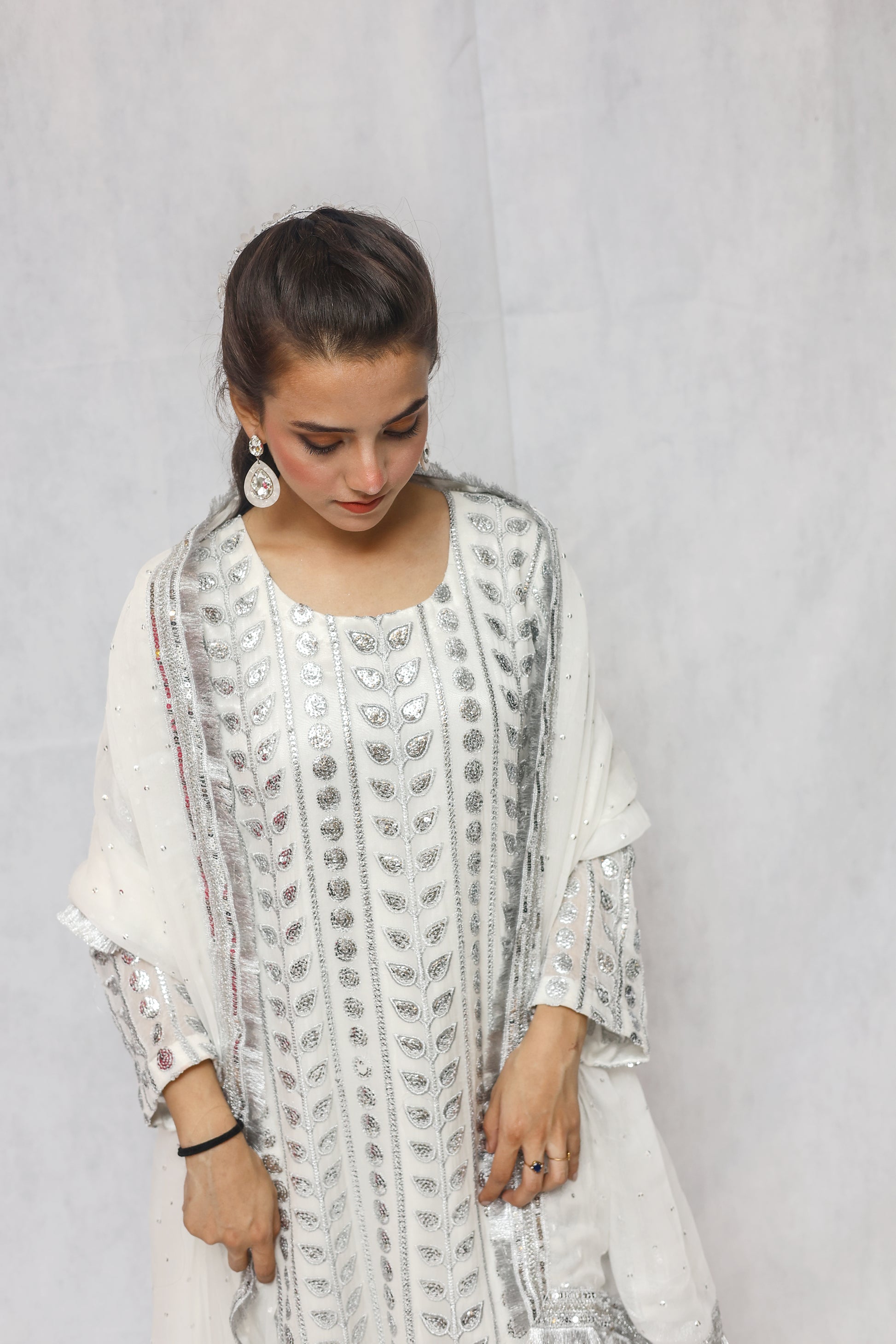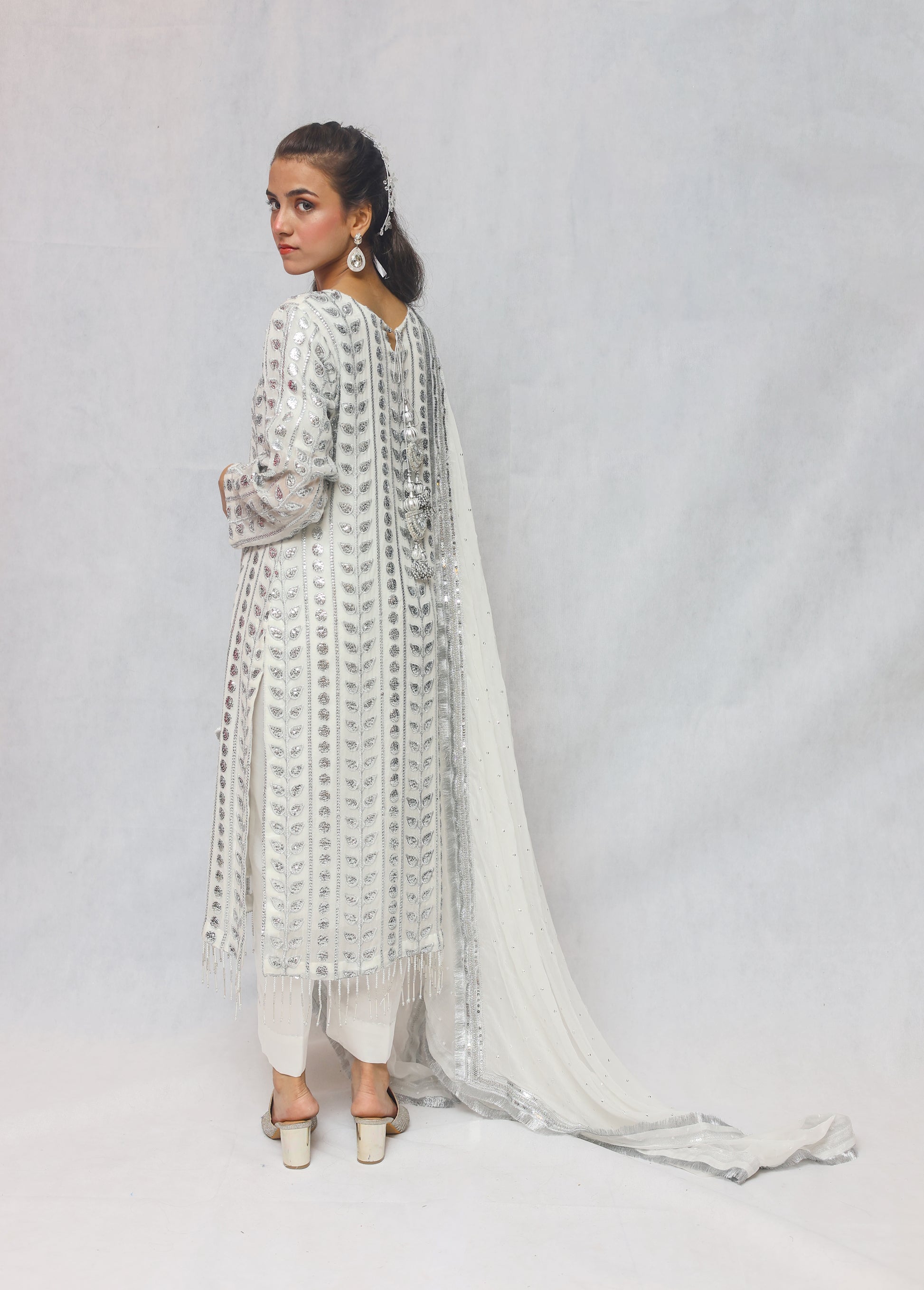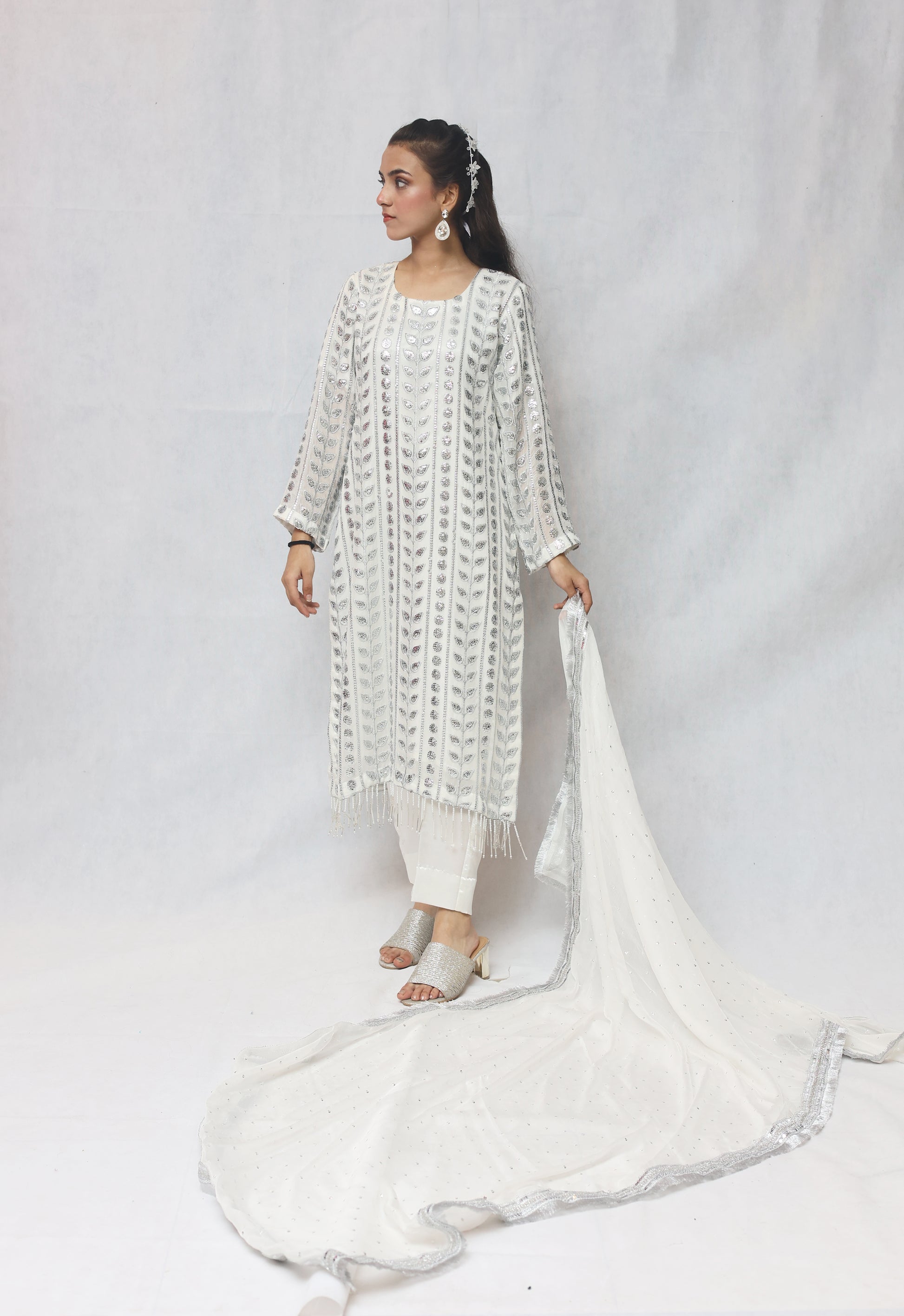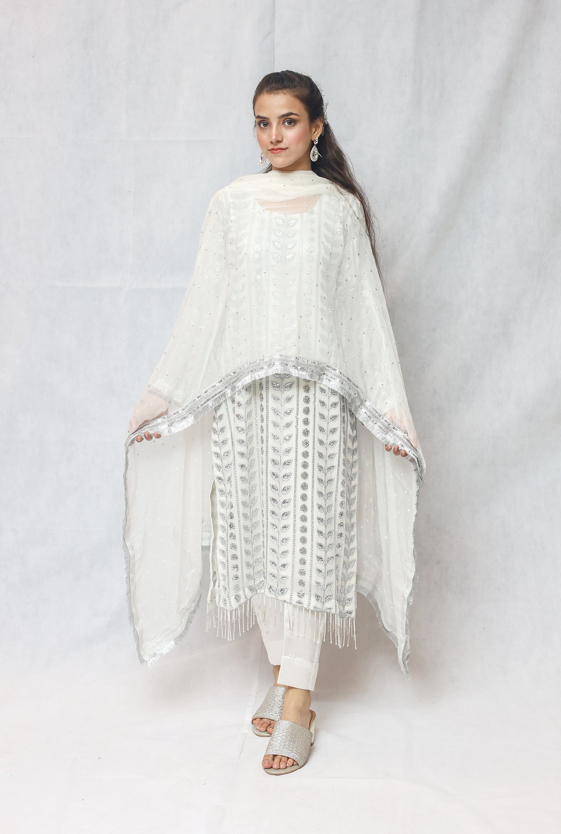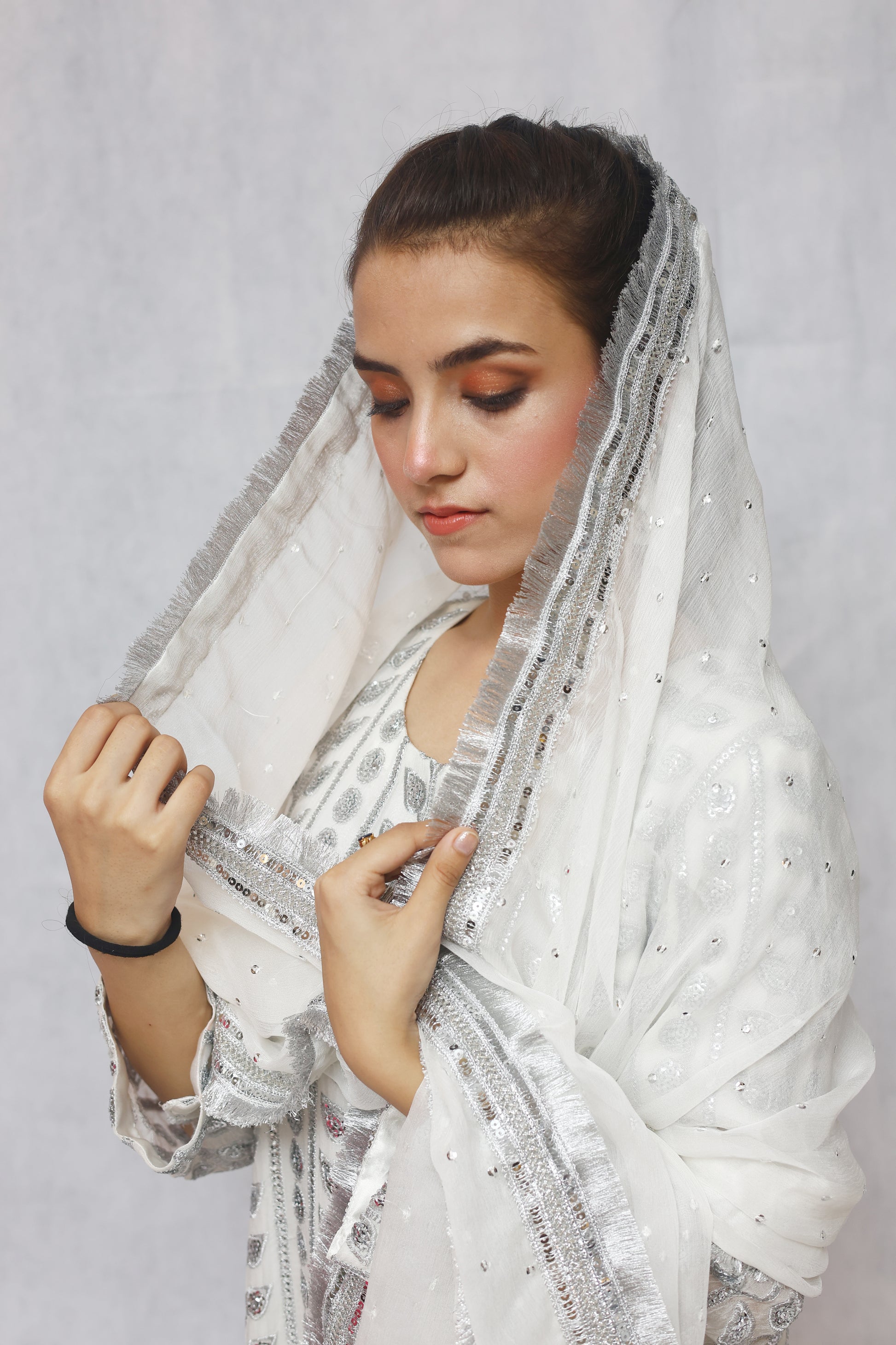 Description: Machine embroidery with silver tilla and sitara work, adorned with elegant silver fringes on the daman. Back neck features a beautiful traditional tassel, while the dupatta is finished with delicate kiran lace. Inner and trouser made from fine silk for a luxurious touch.