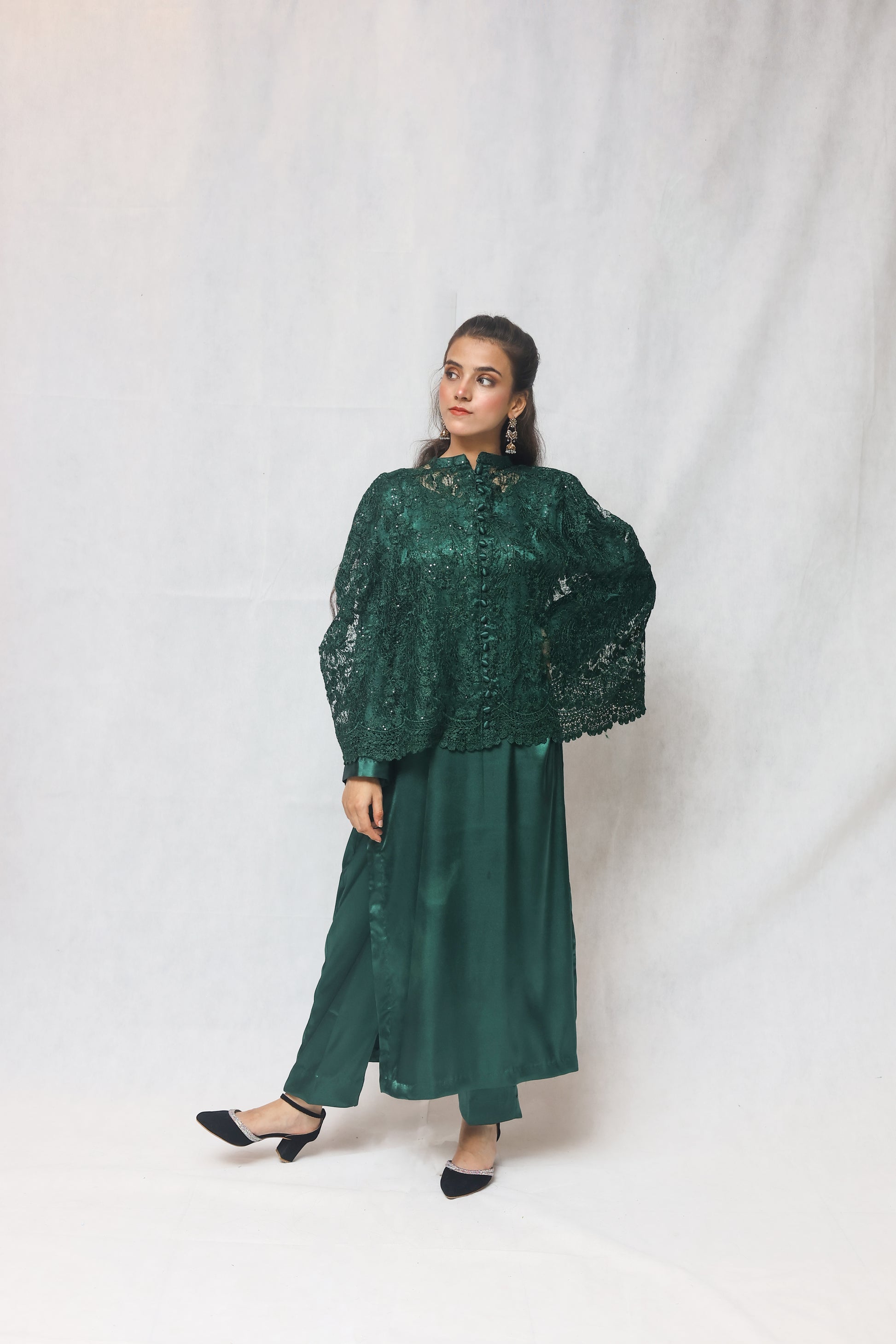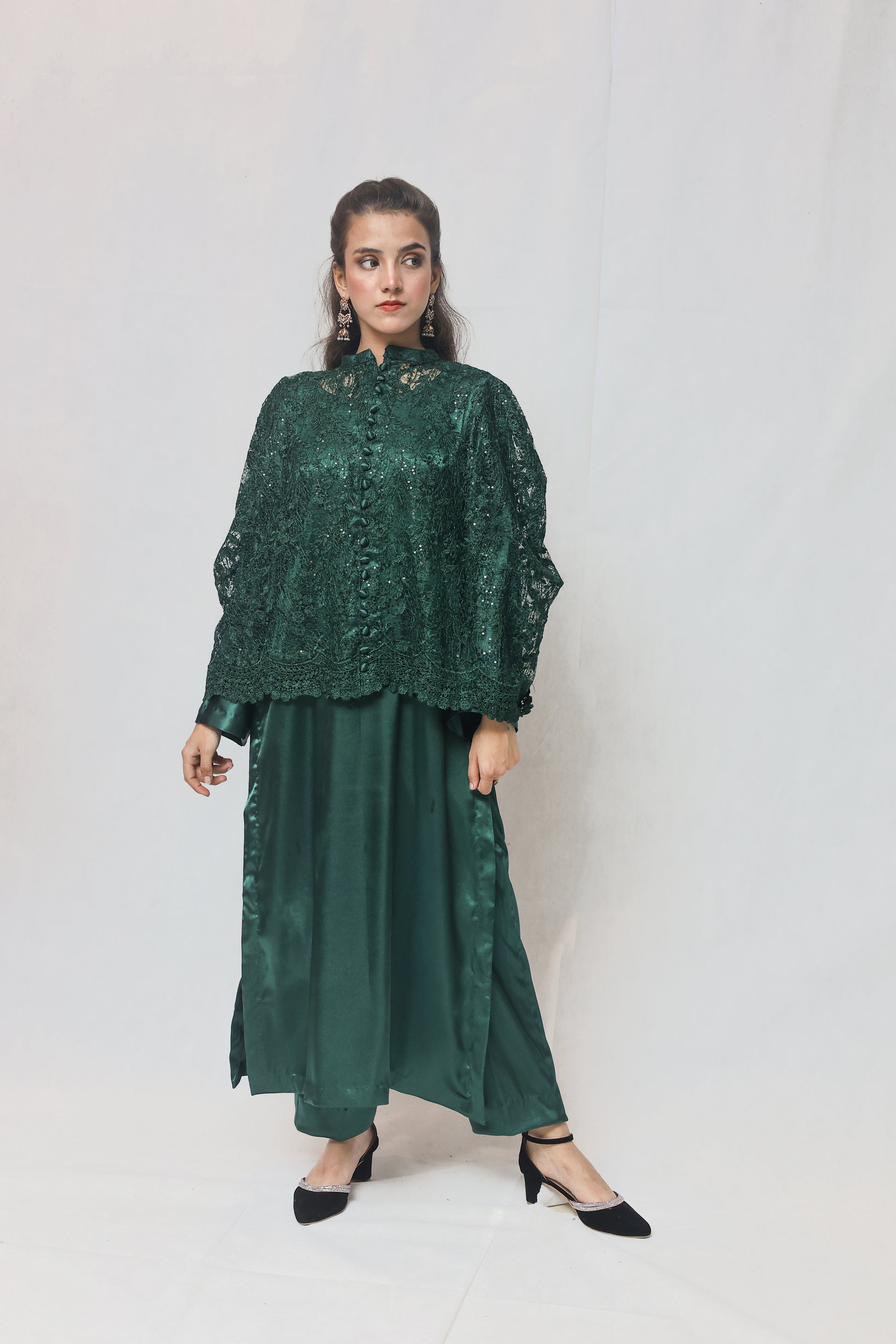 Description: Delicate sequin work, fine net lace design, and graceful silk-covered buttons