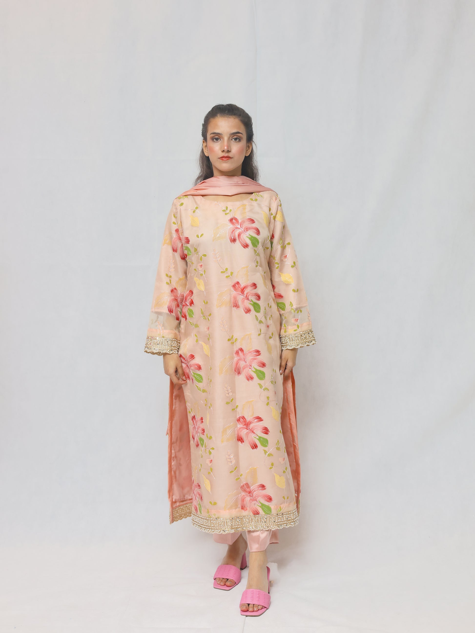 Description: A pure organza outfit with delicate floral desighn, accented with pearl and mirror lace on the sleeves and hemline, paired with a smooth silk dupatta for a refined finish.