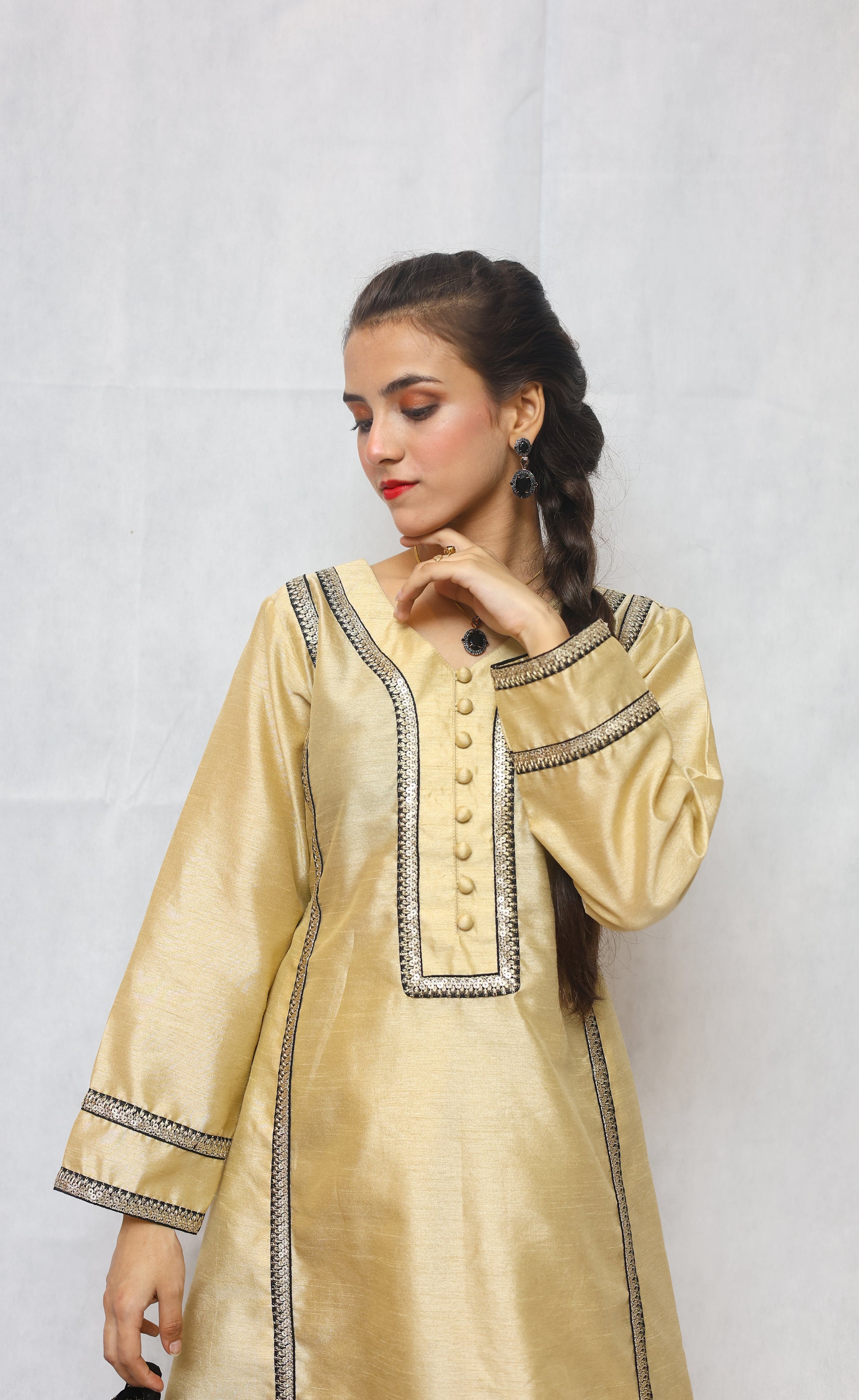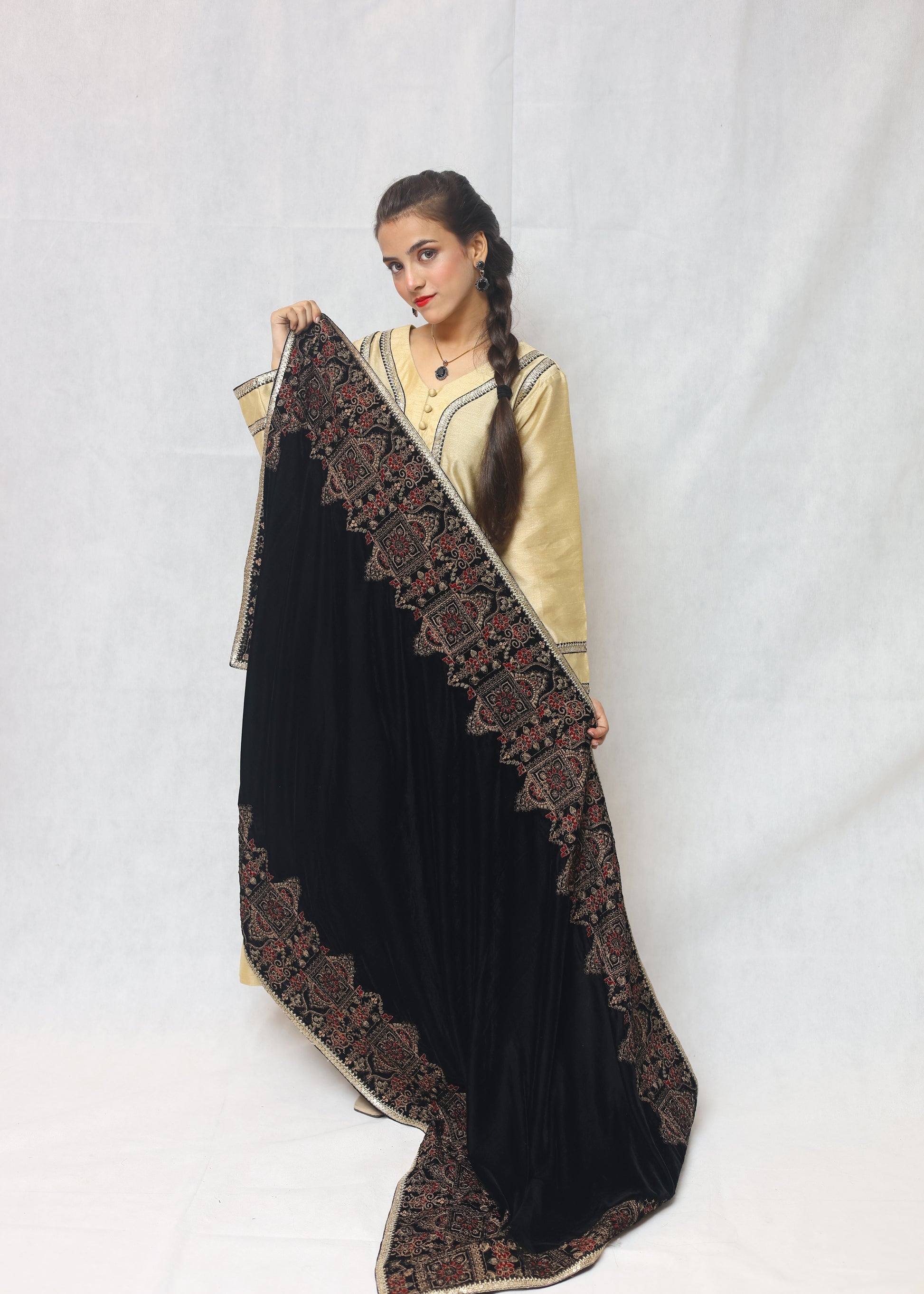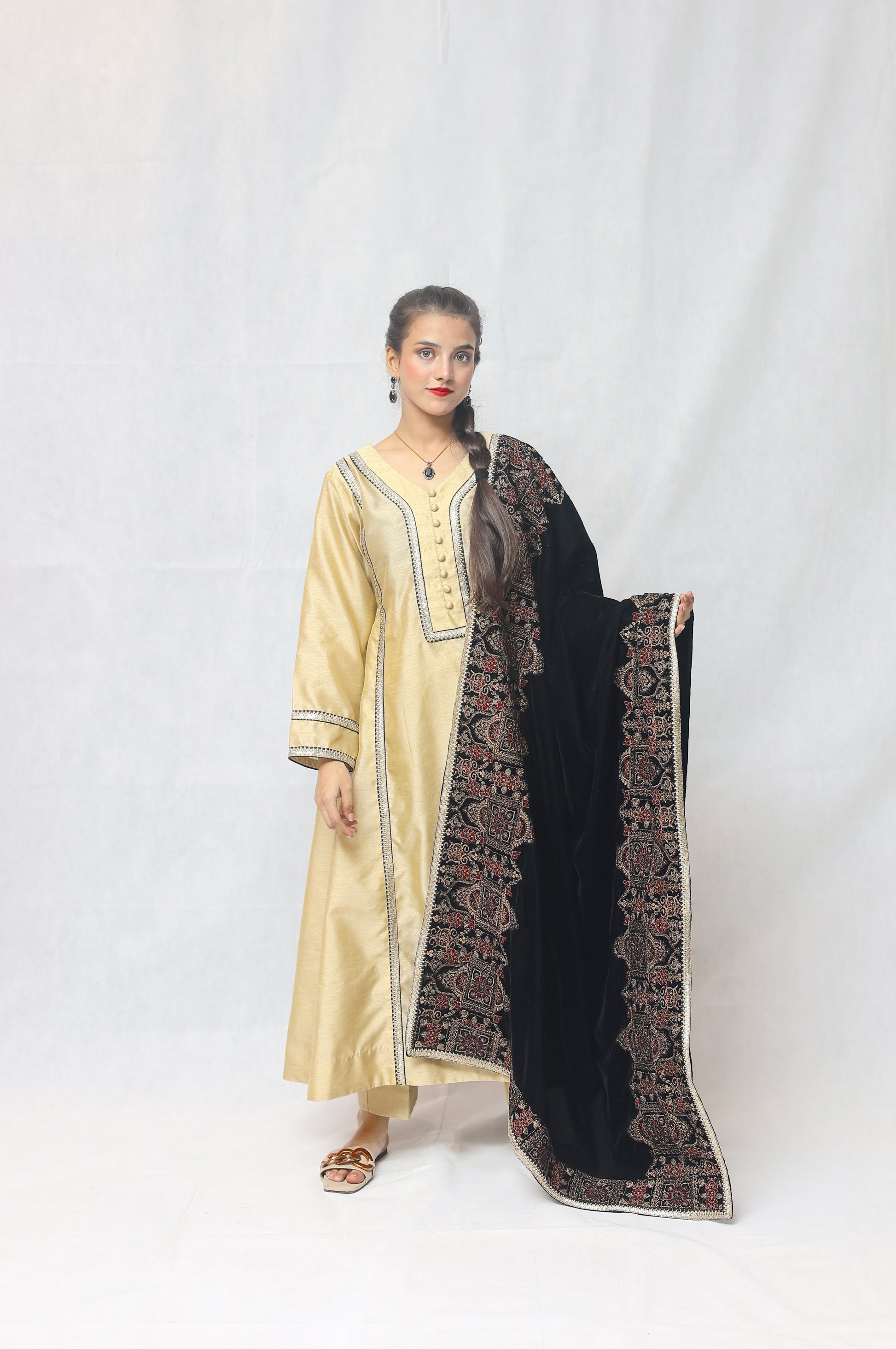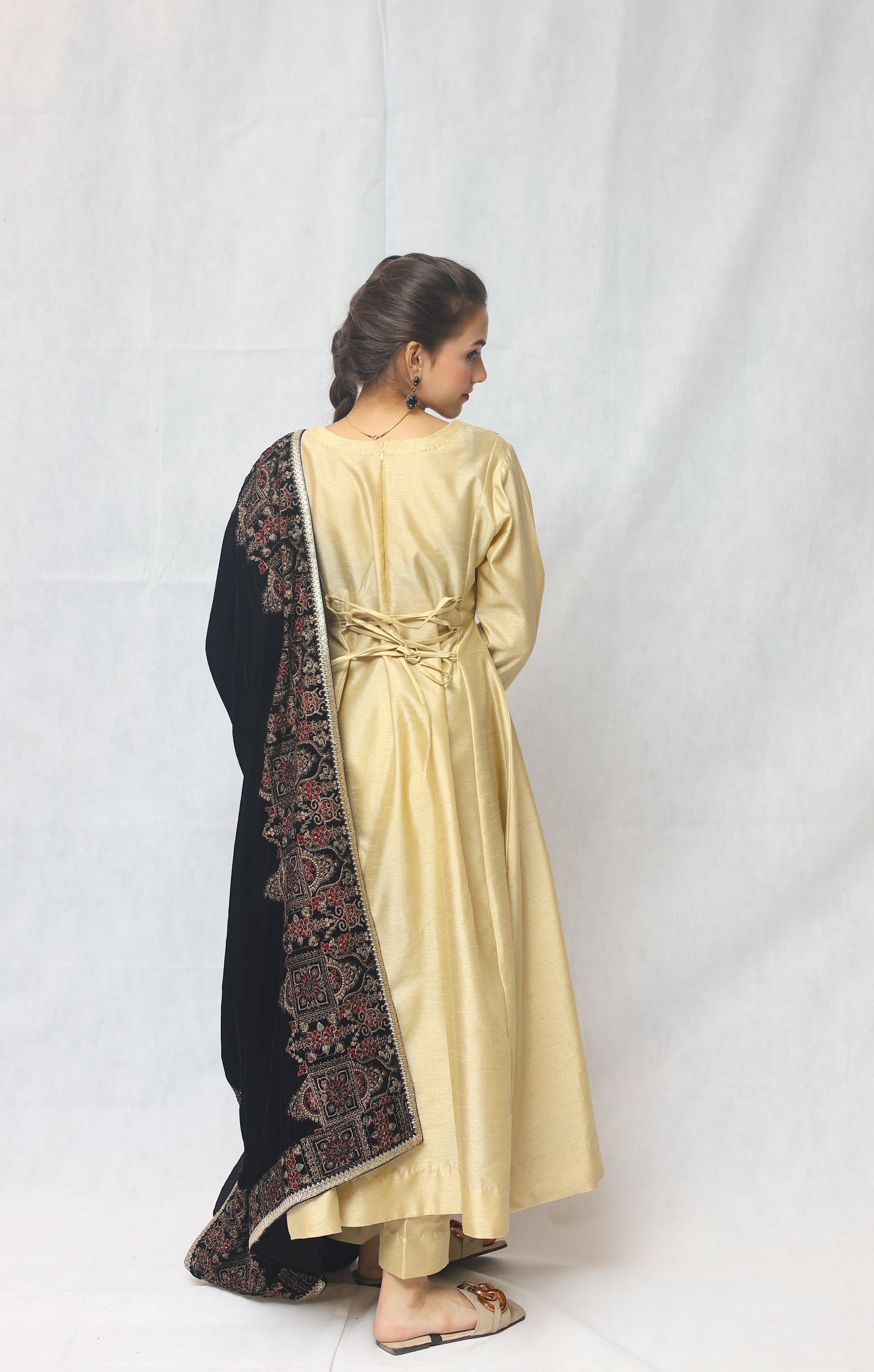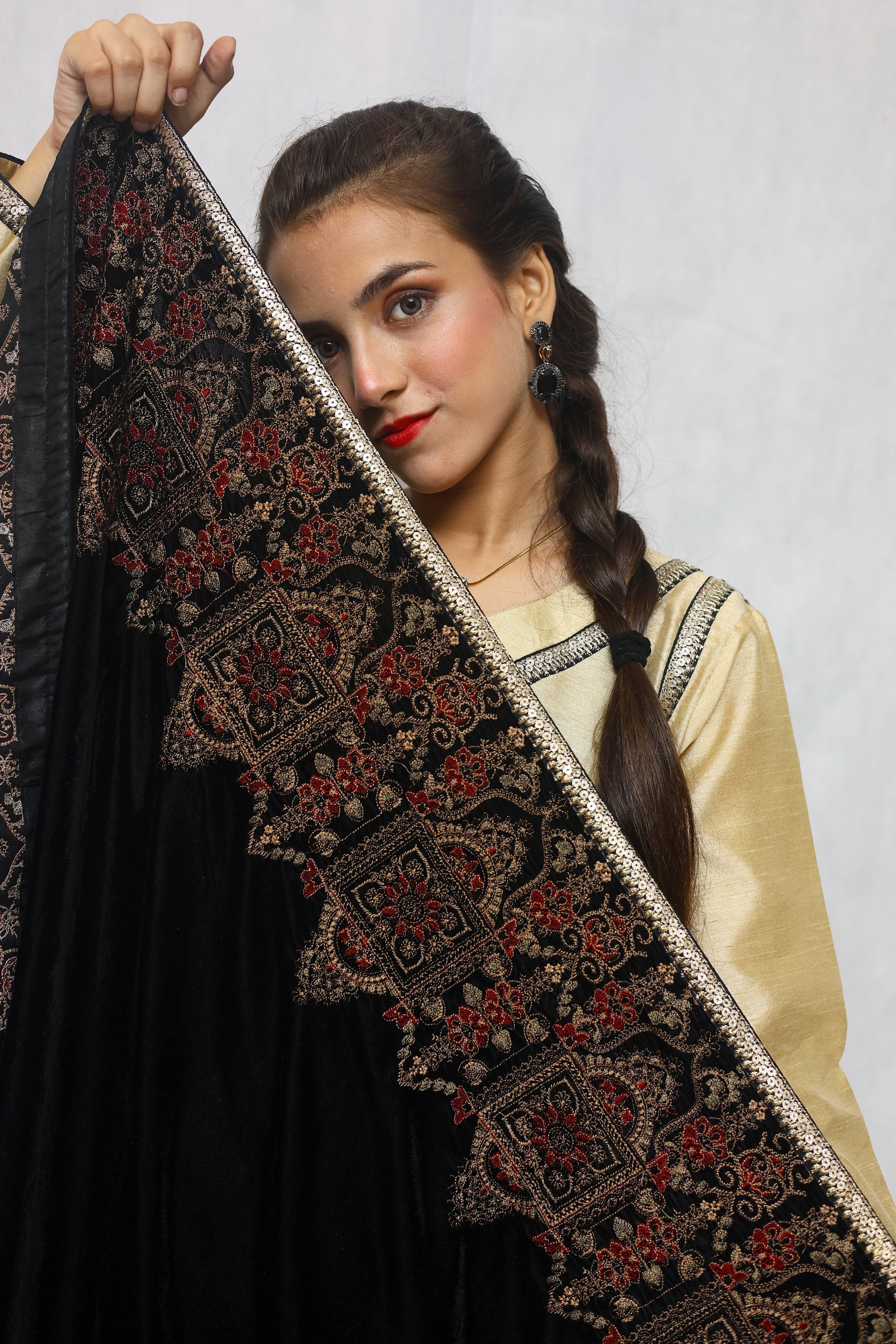 Description: A graceful raw silk umbrella frock with black lace detailing, paired with an embroidered velvet shawl finished with lace for a refined look.
