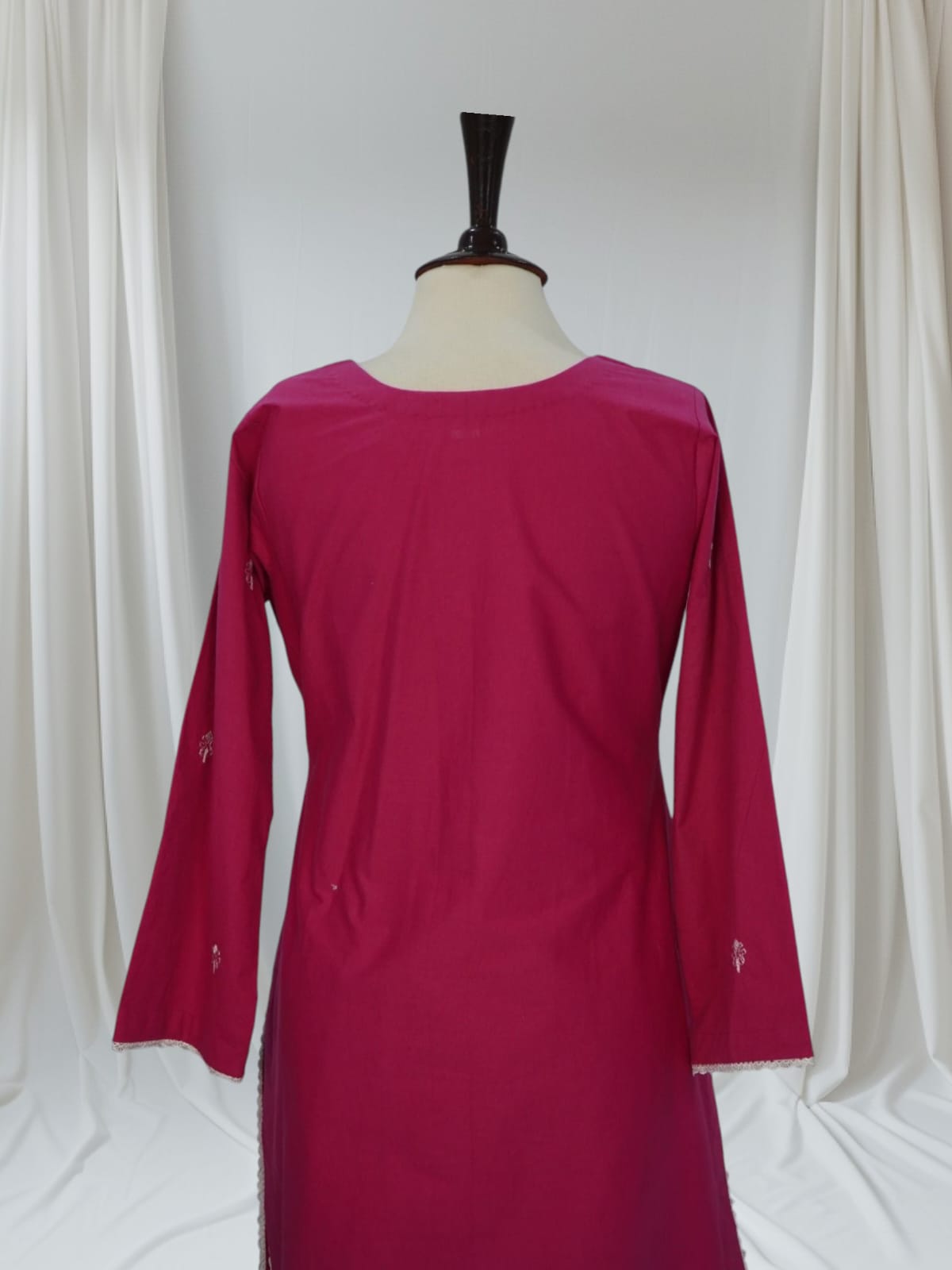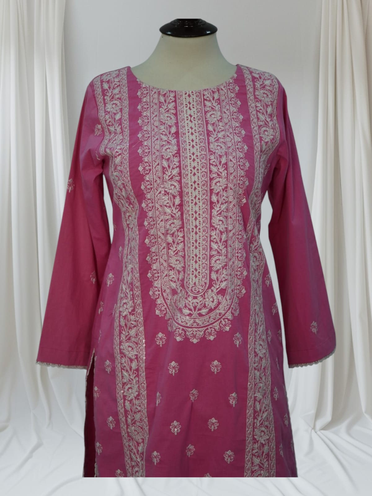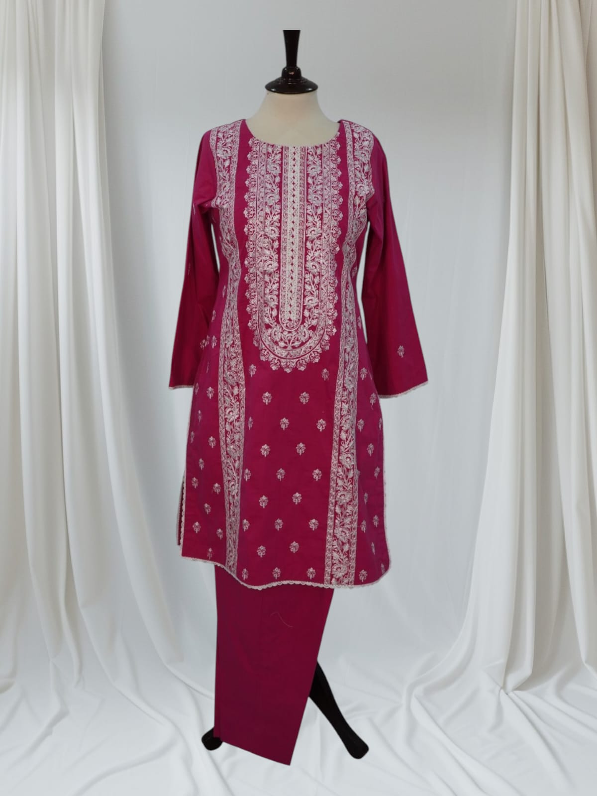Description: A refined winter cotton outfit adorned with intricate thread embroidery on the front panel, sleeves, and borders. The elegant motifs and clean finishing add a touch of timeless charm, making it a perfect pick for warm, graceful winter wear.