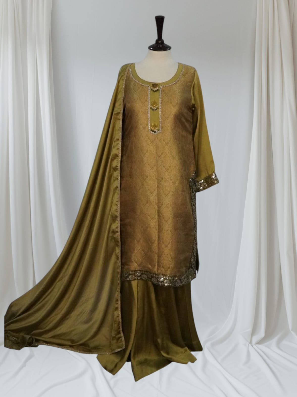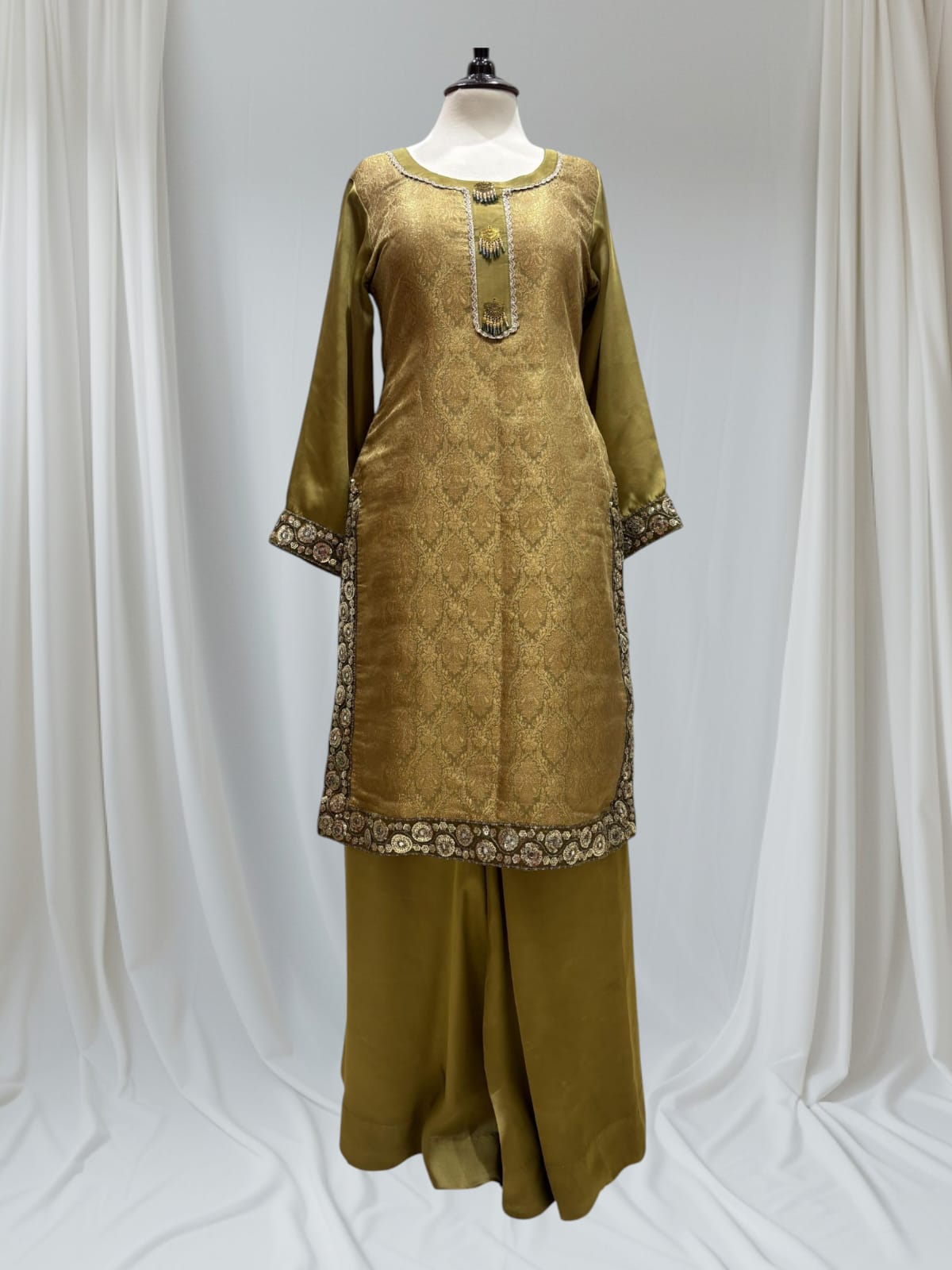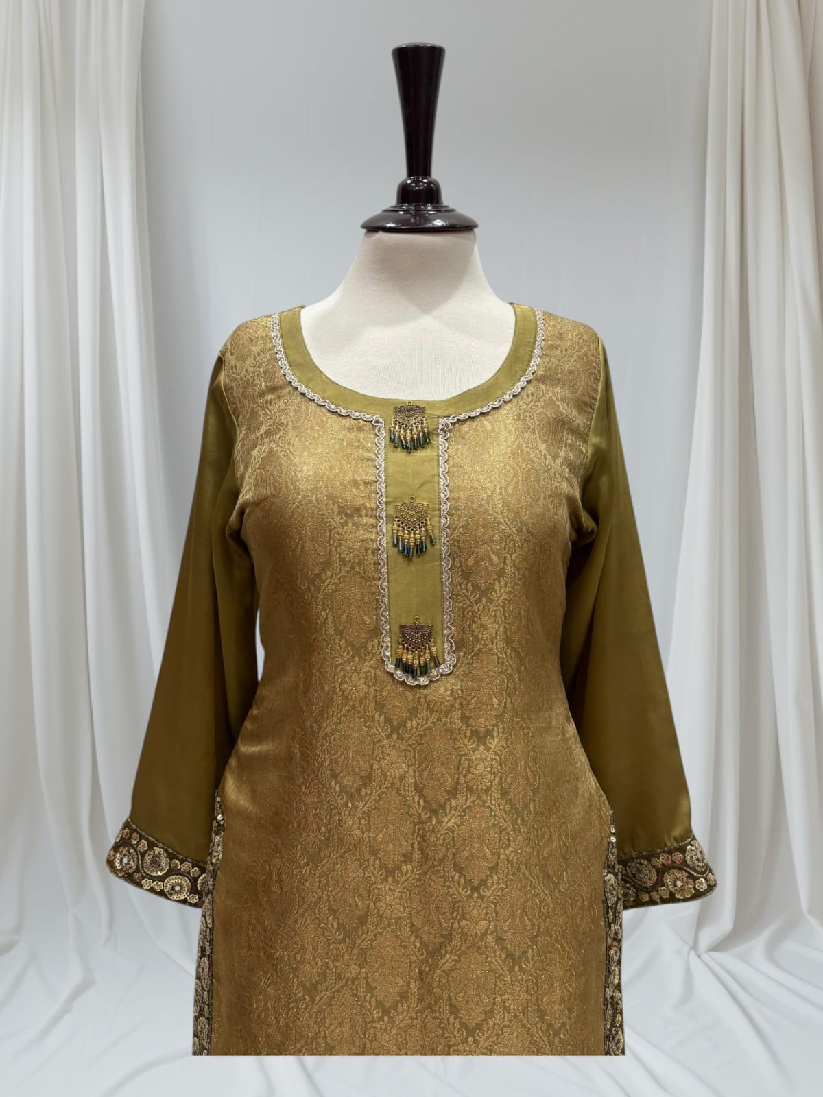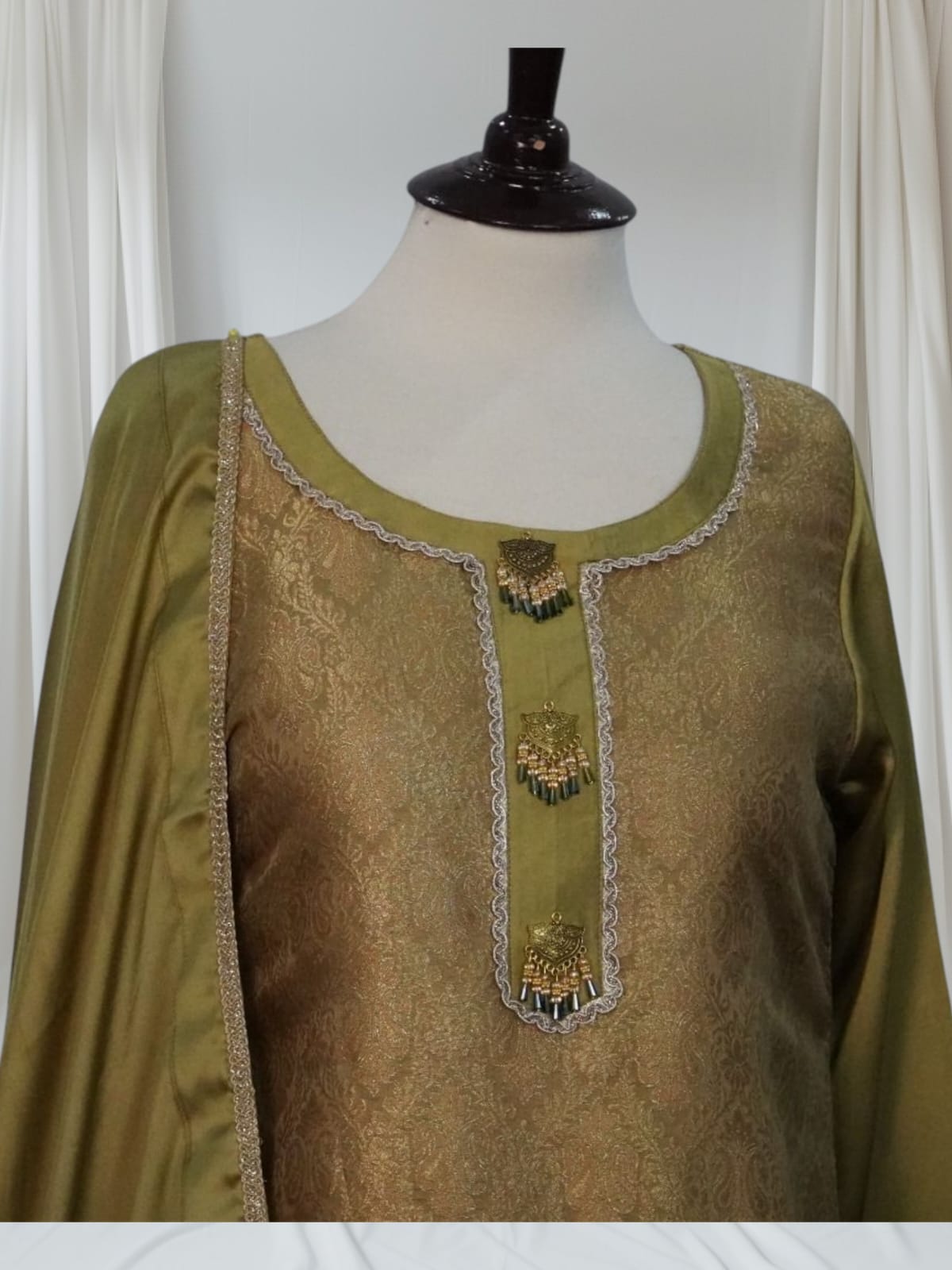 Details: Beautiful jamawar texture paired with elegant lace finishing on sleeves and border, enhanced with delicate tassel accents for a graceful, timeless look.