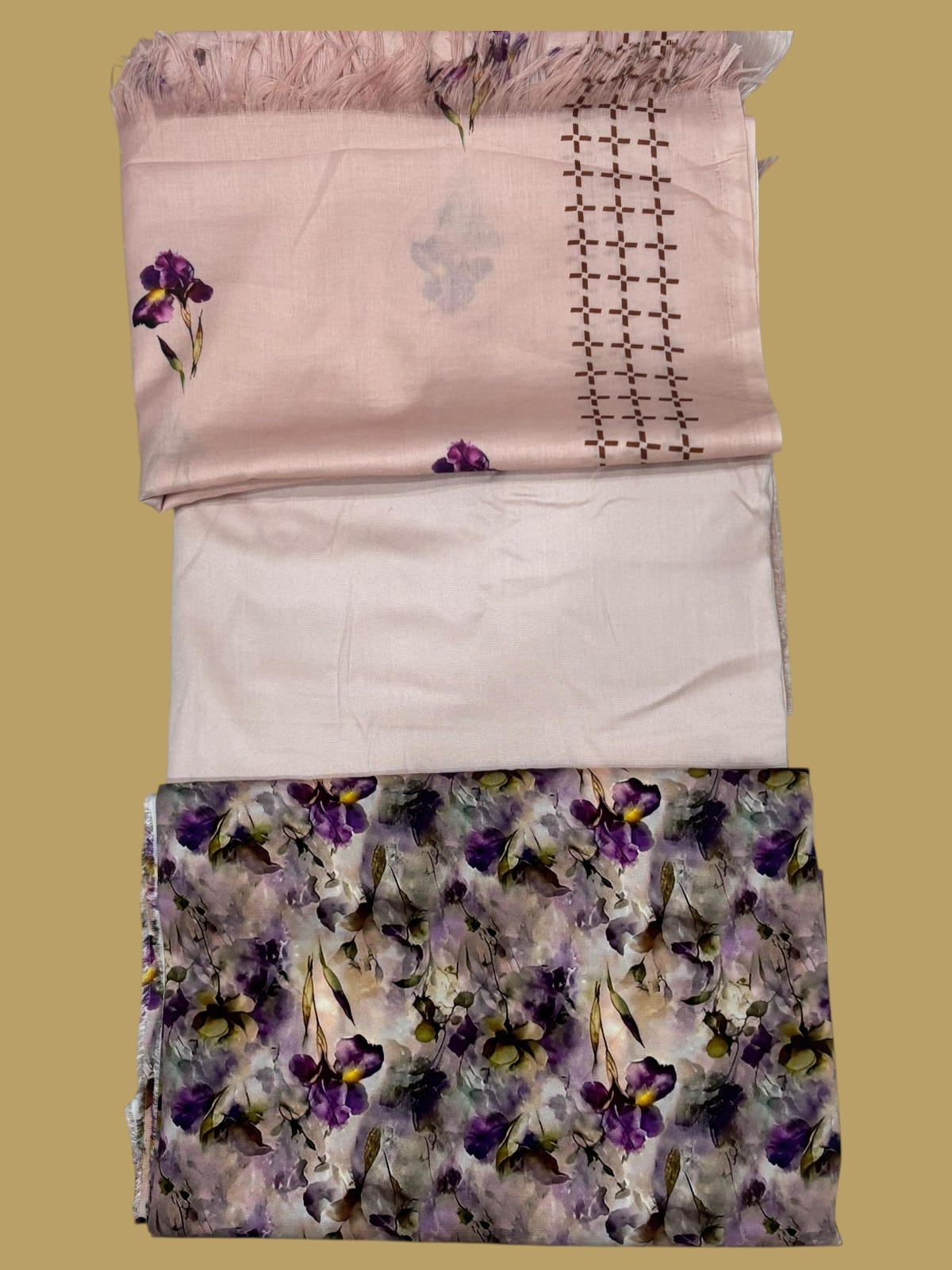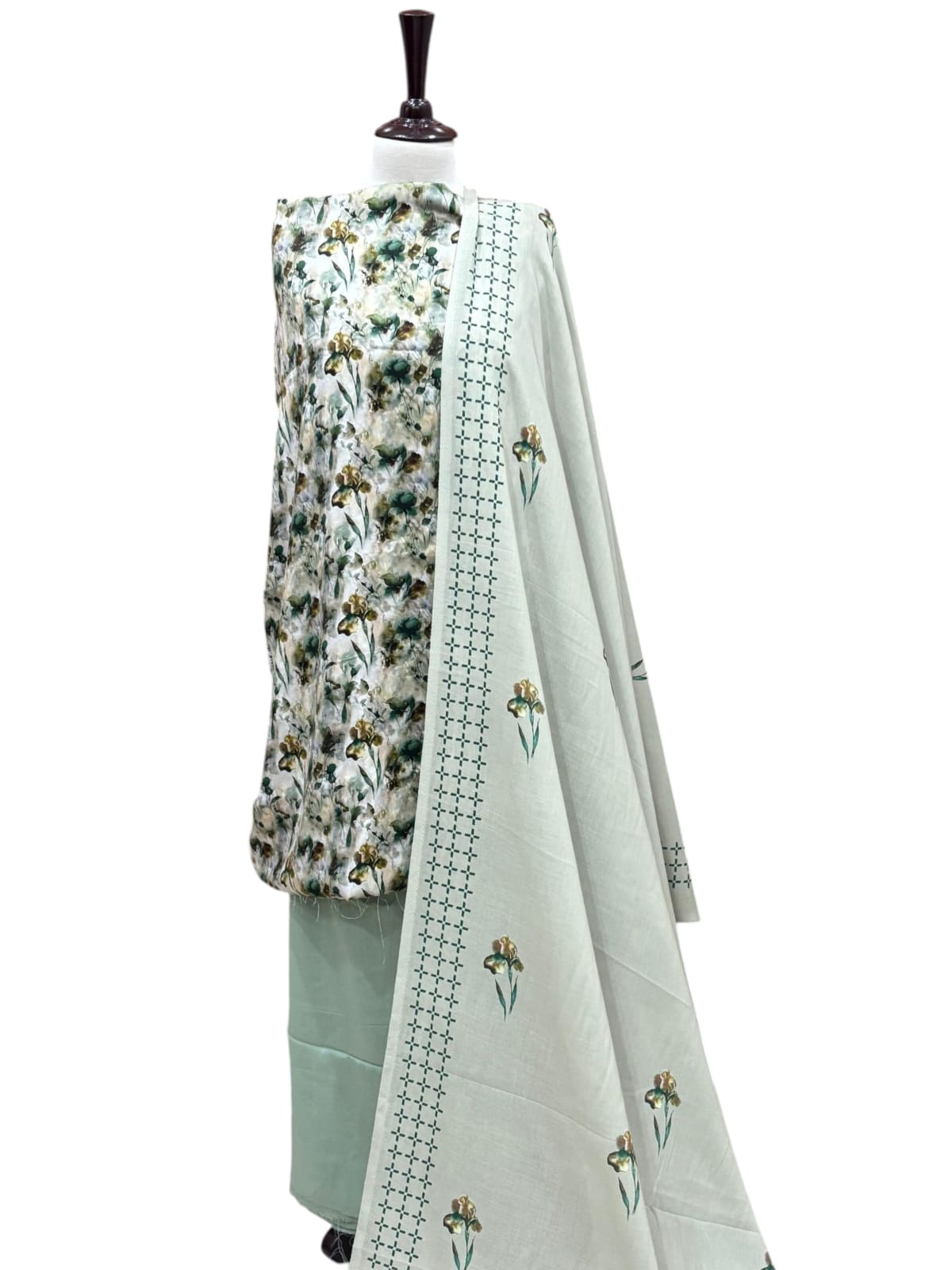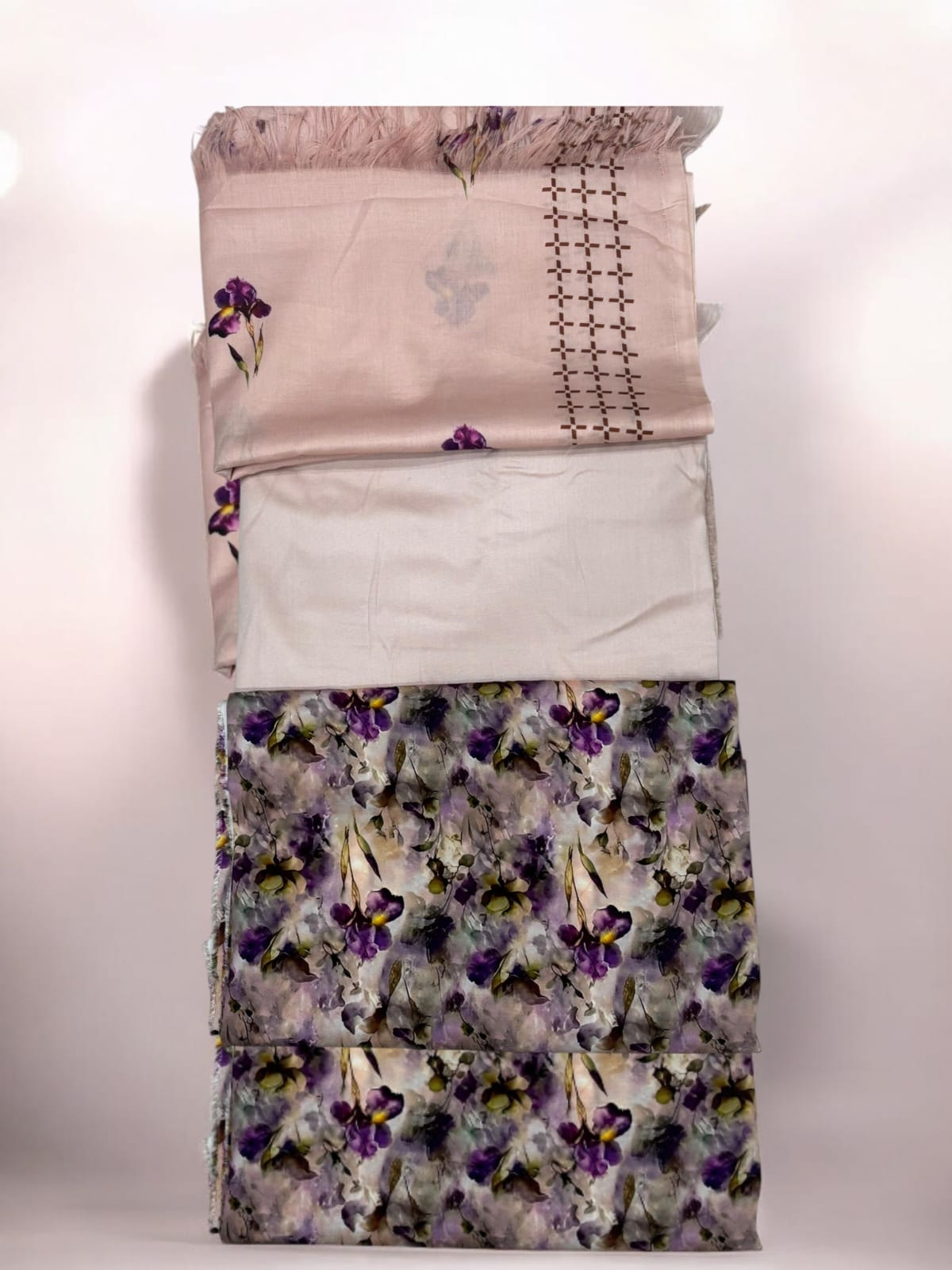 Description: Soft marina fabric featuring a graceful blue floral print on a subtle grey base, paired with a matching printed dupatta and plain trouser — ideal for a cozy and refined winter look.