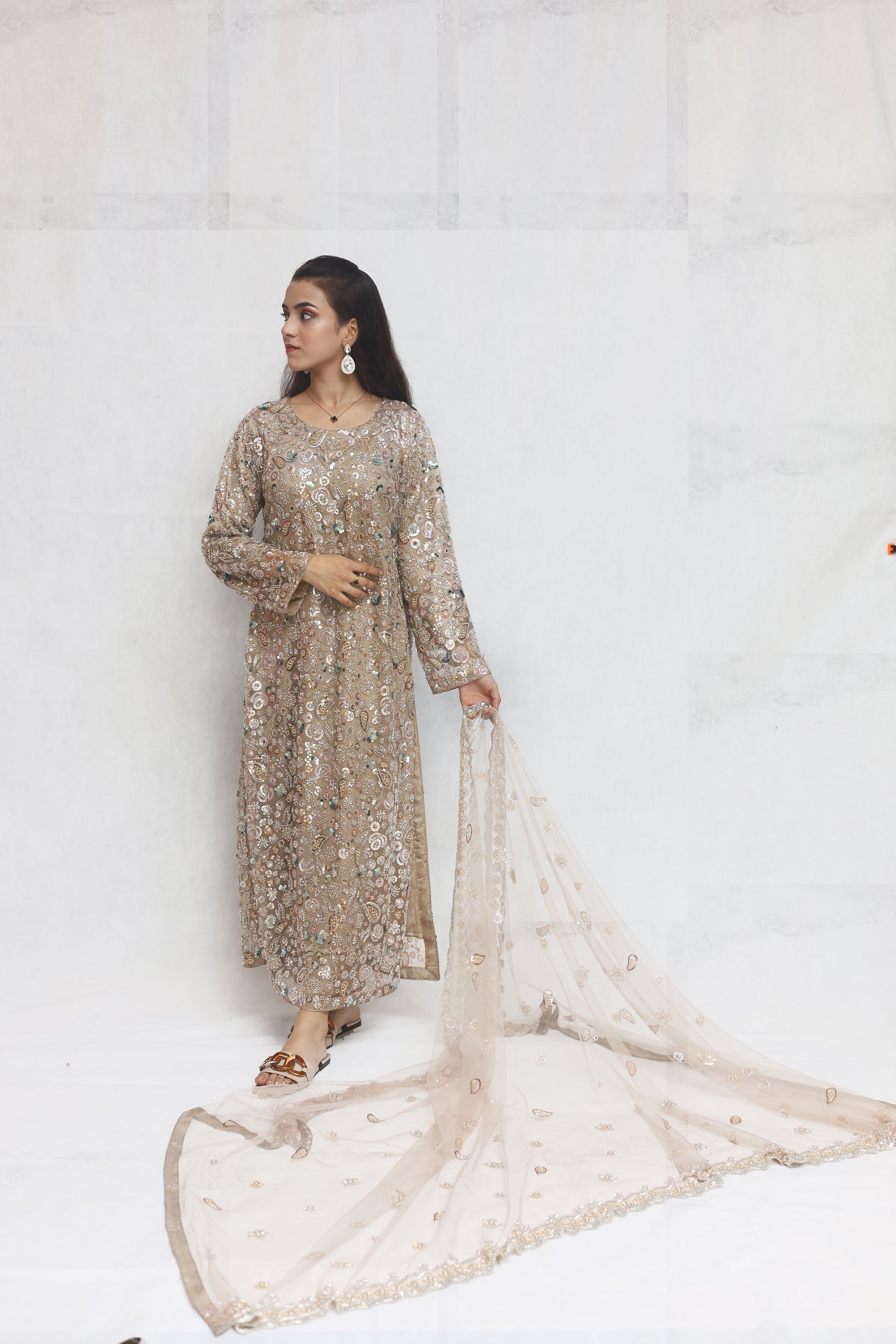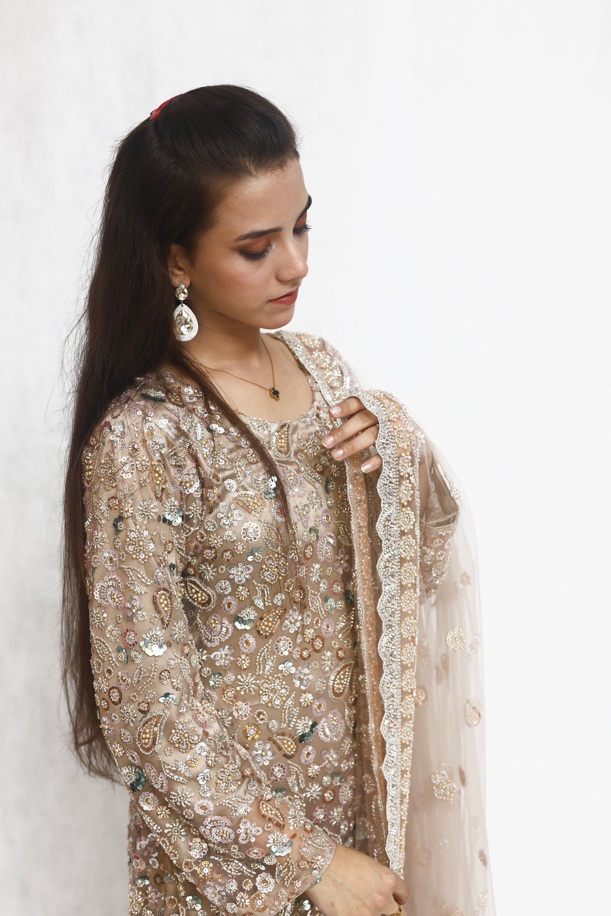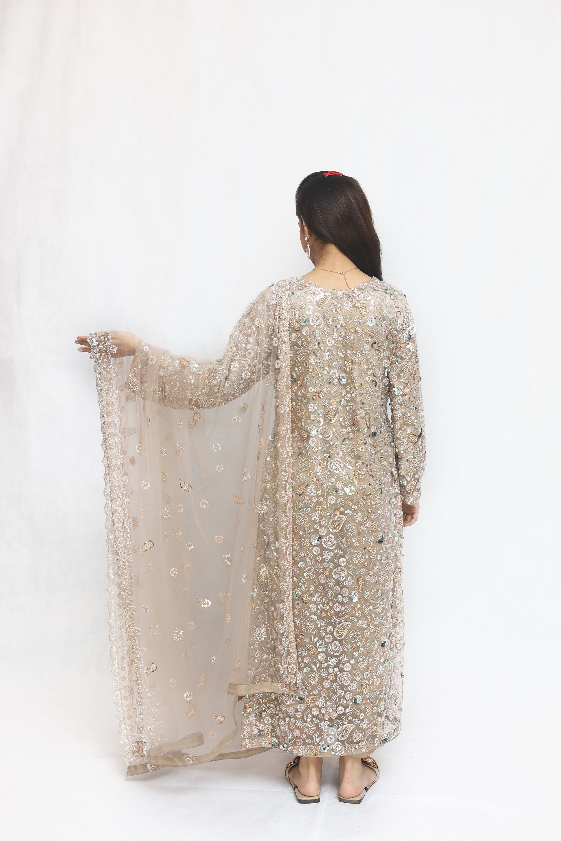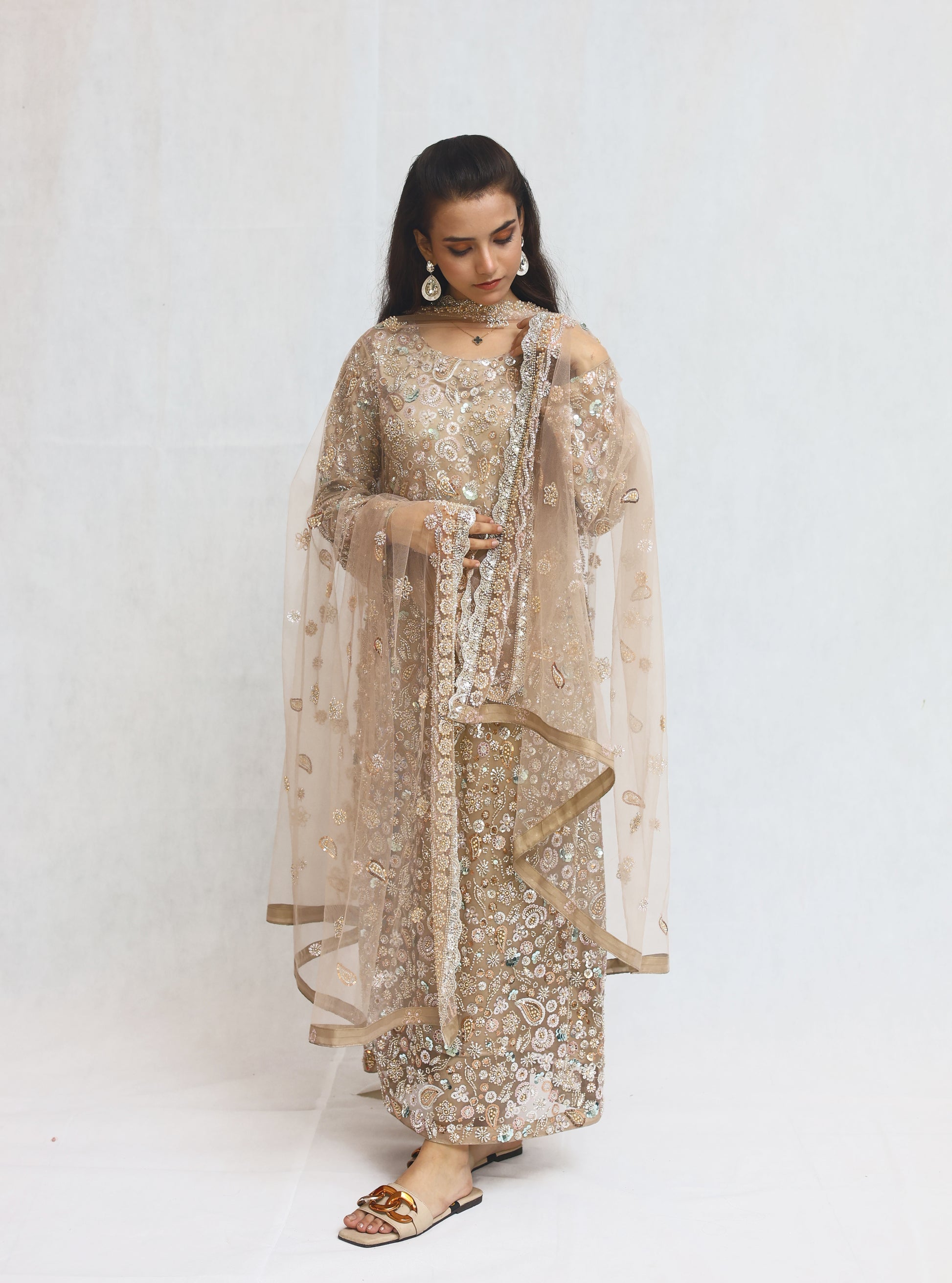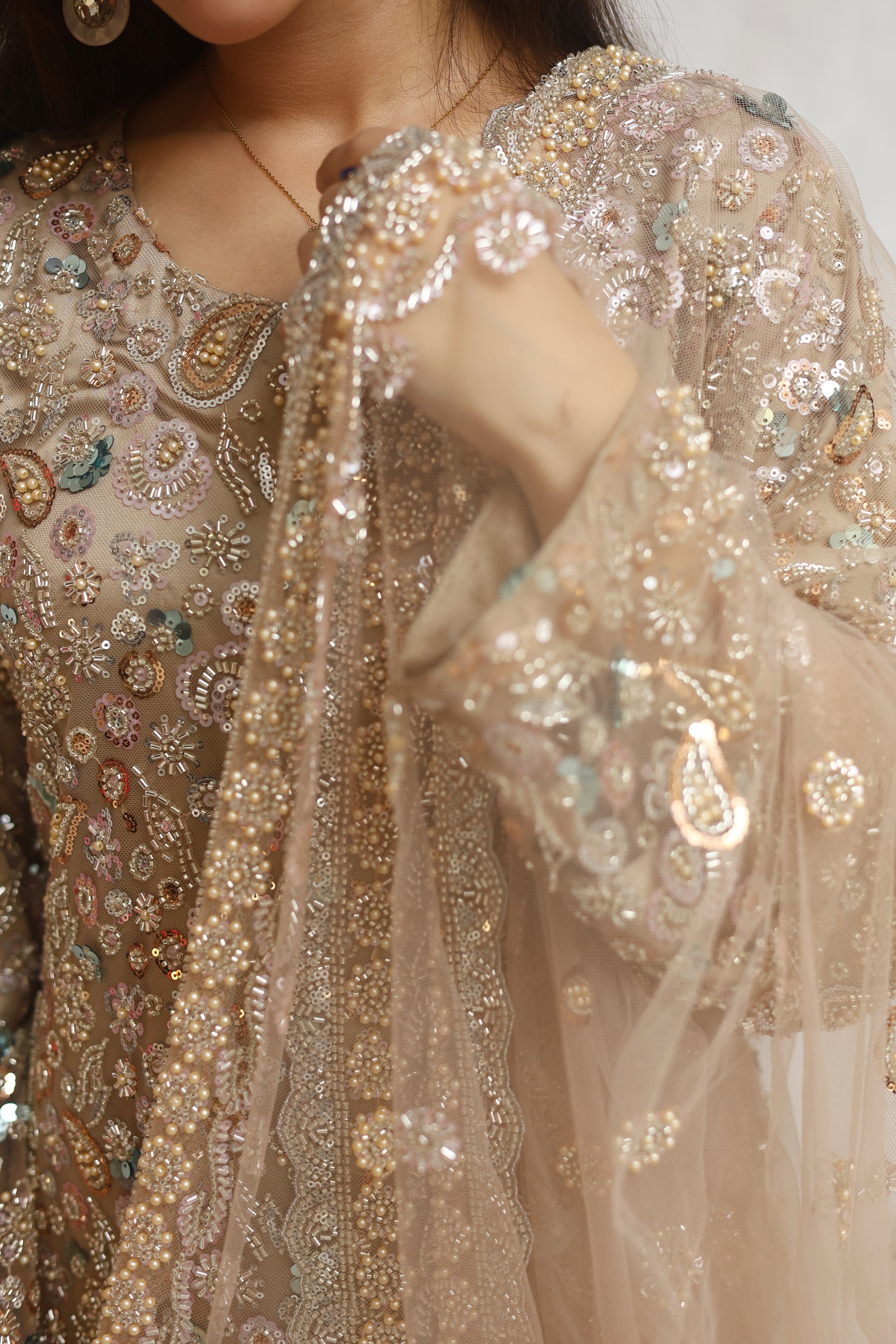 Details: Moonlit Grace is a soft beige ensemble in fine net, adorned with cutdana, pearls, and sitara work that shimmers beautifully. Paired with an embellished dupatta and shamoz silk inner, it embodies timeless elegance and luxury.