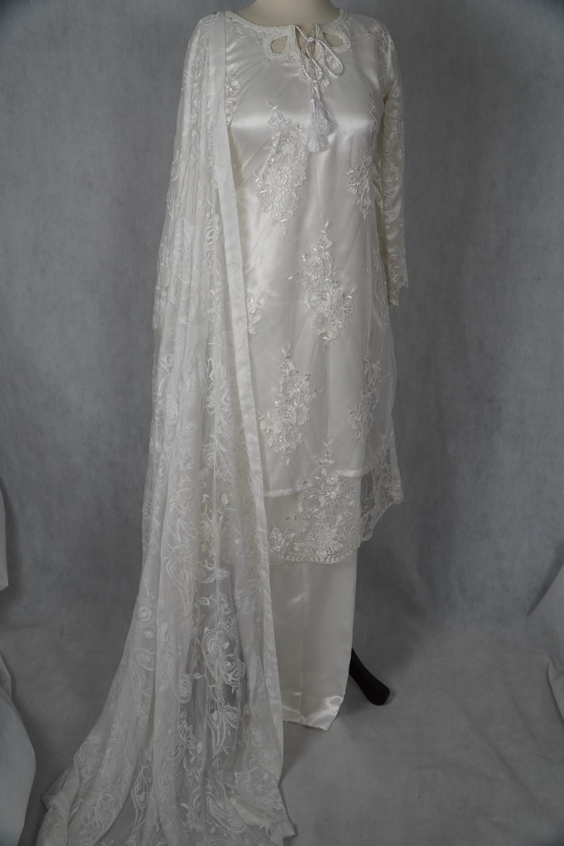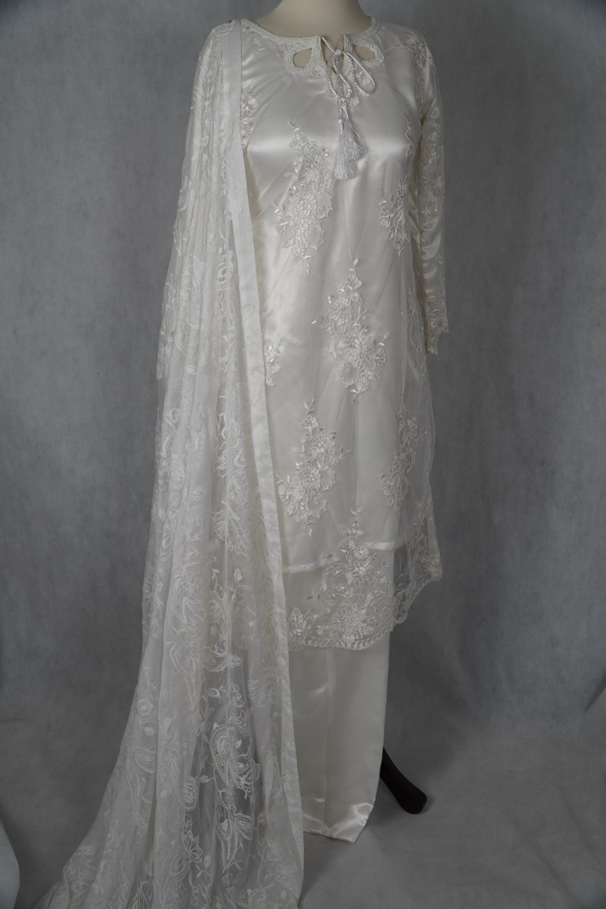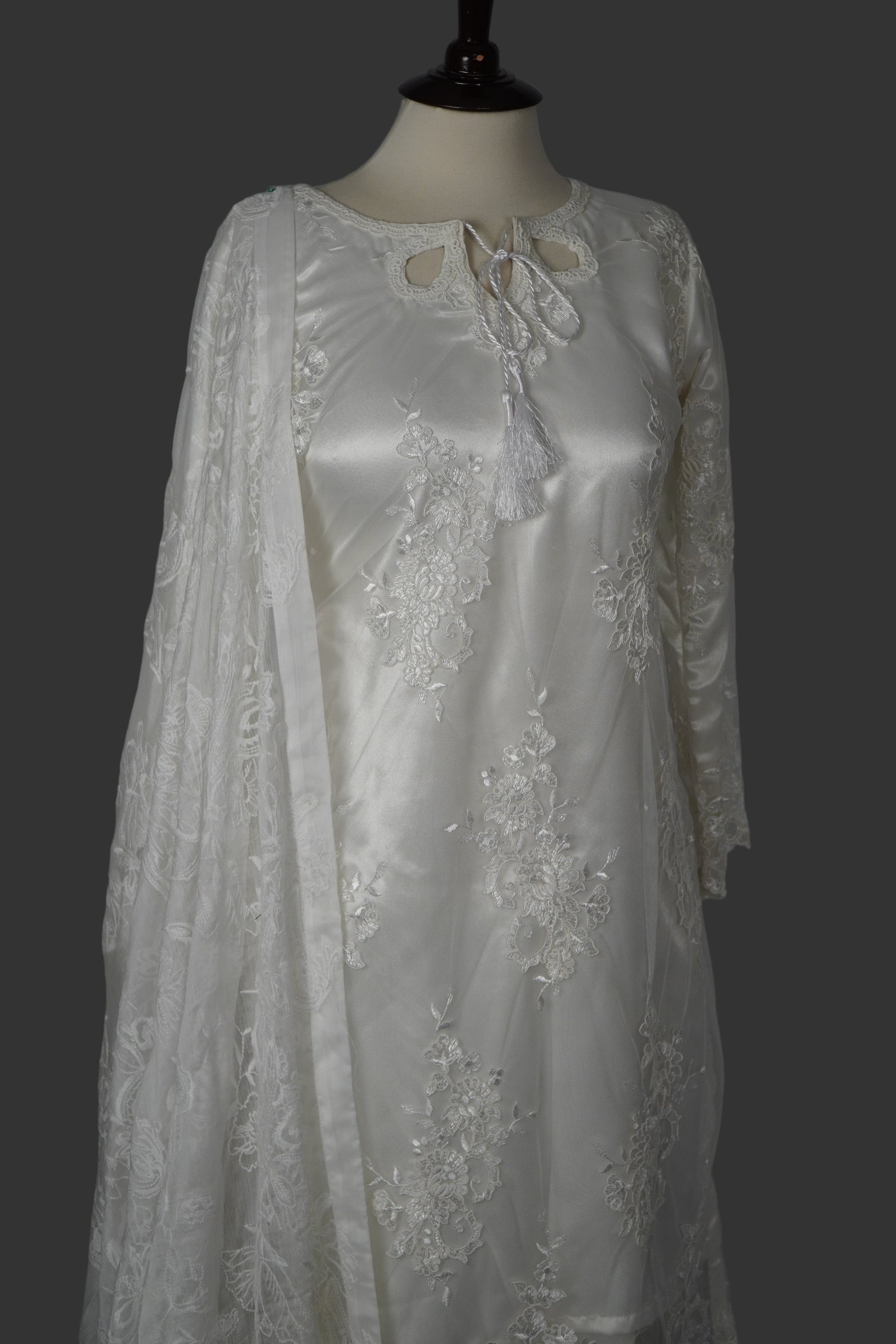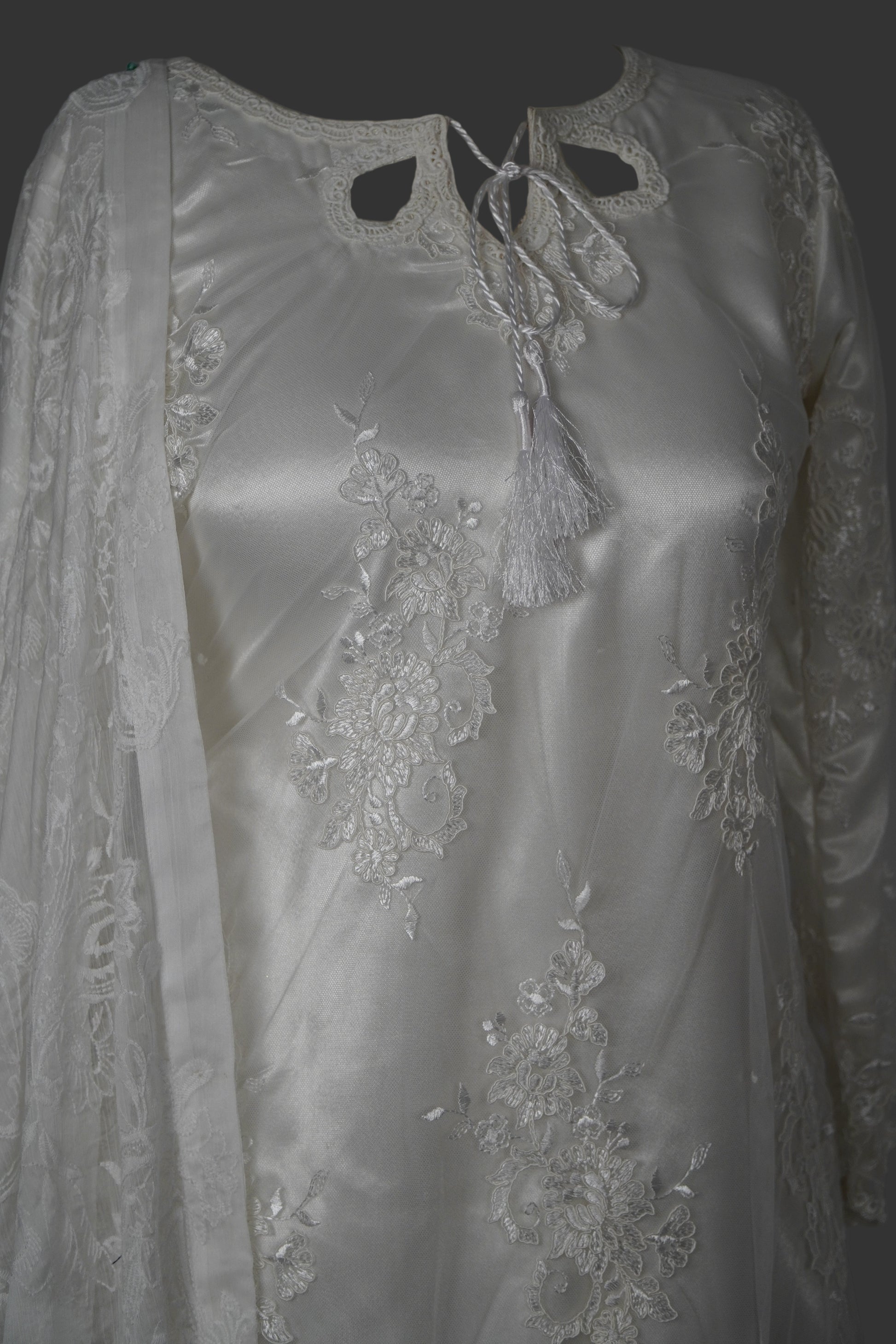 Description: A beautifully crafted ivory silk shirt adorned with delicate net embroidery and subtle floral motifs. Paired with a matching embroidered net dupatta for a graceful, timeless finish.