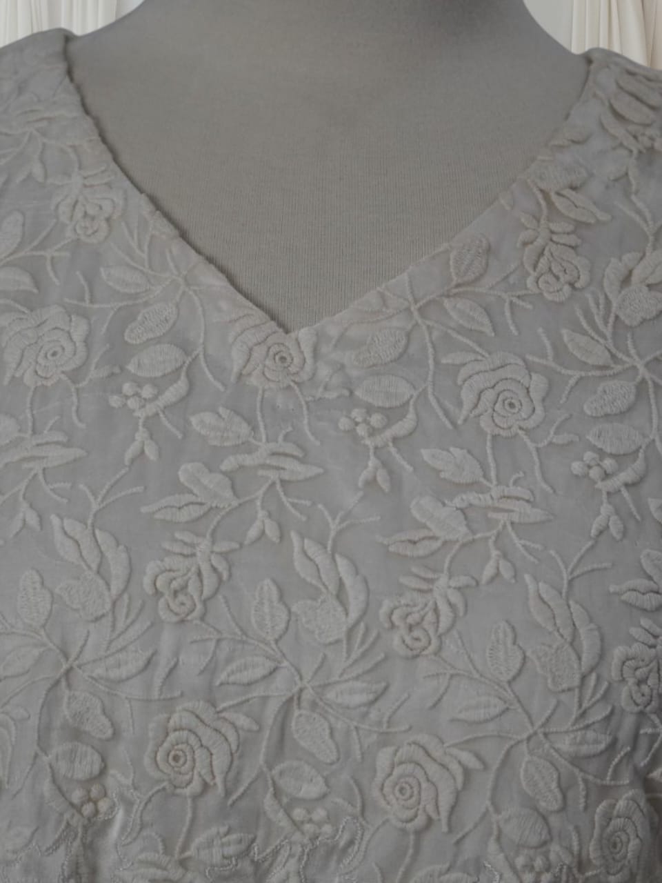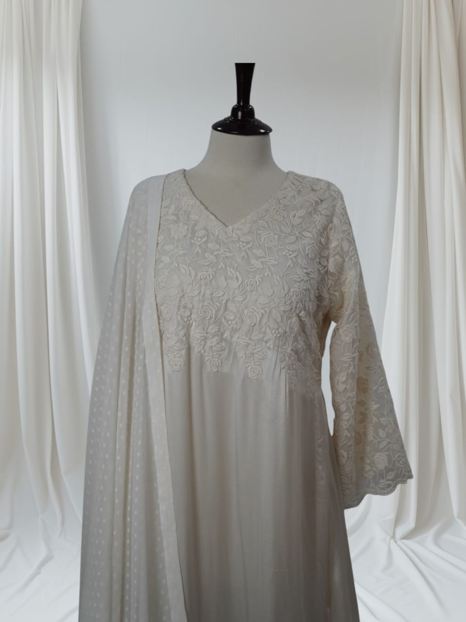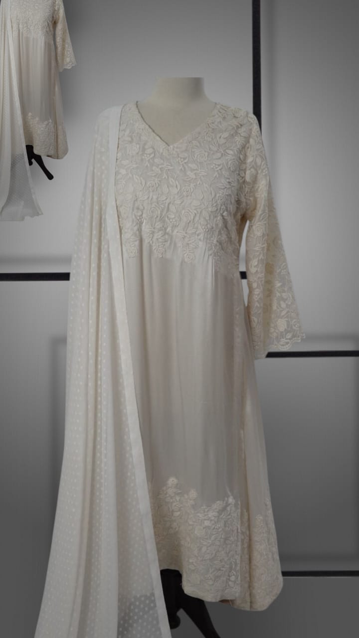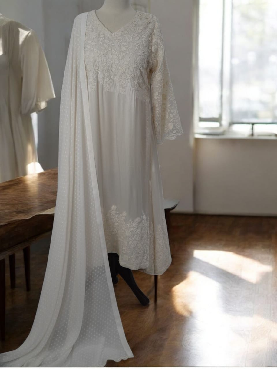 Description: Pure silk shirt adorned with pure embroidered organza applique, creating a refined and elegant texture. Paired with a soft pure chiffon dupatta and matching trousers for a timeless, graceful look.