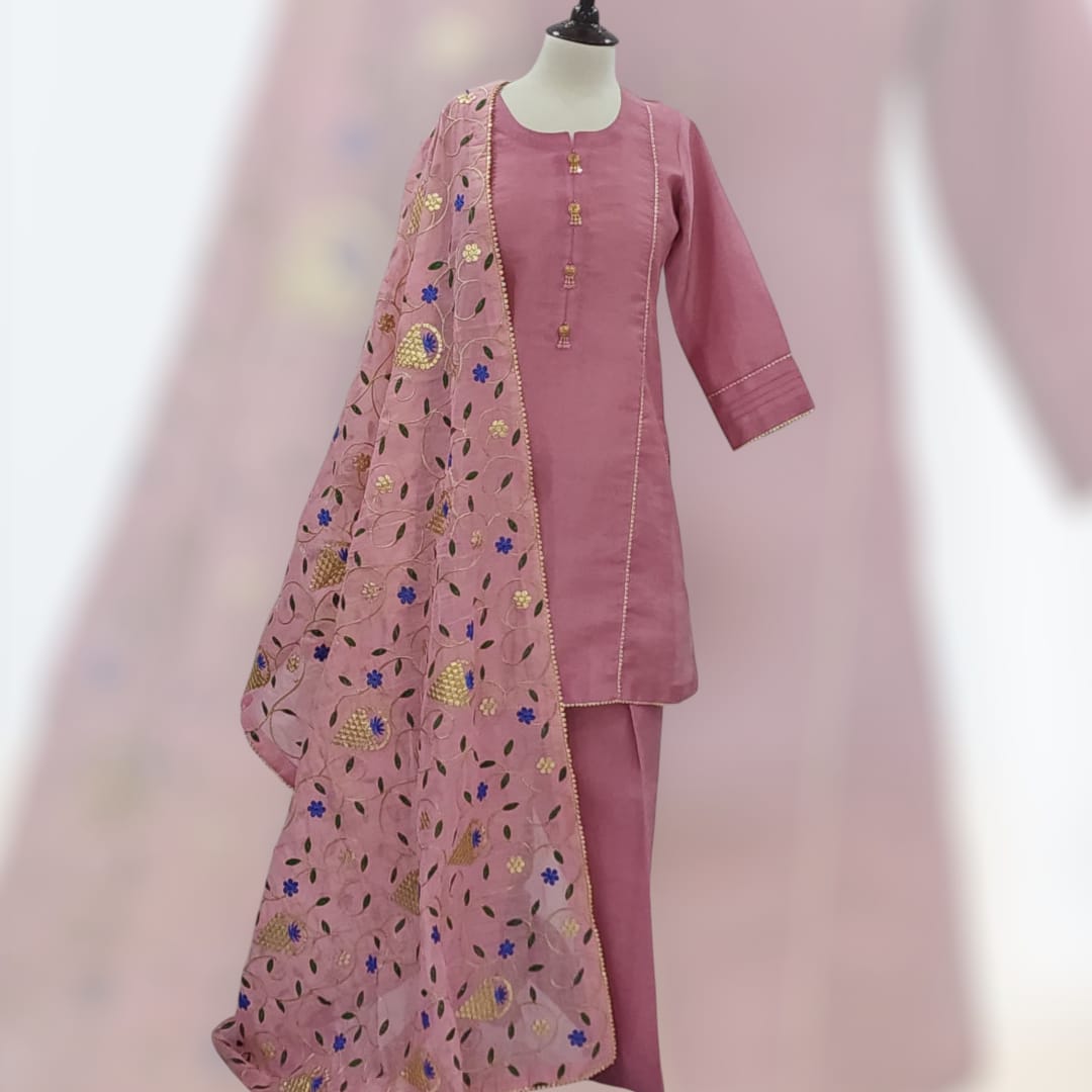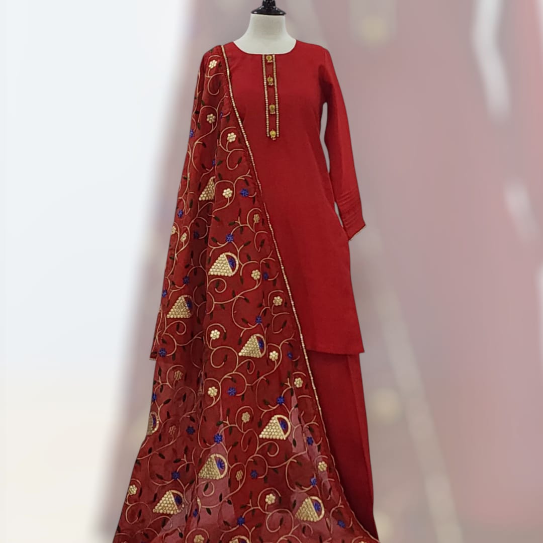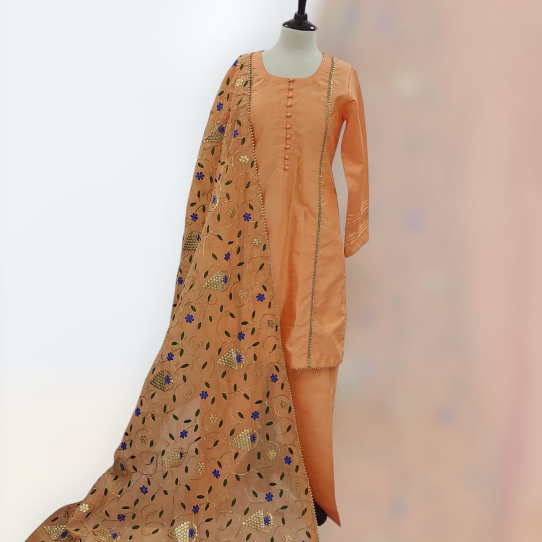 Description: Elegant raw silk shirt adorned with lace finishing and front tassels, paired with a beautifully crafted khaddi embroidered dupatta detailed with lace edging and multicolor threadwork for a refined festive look.