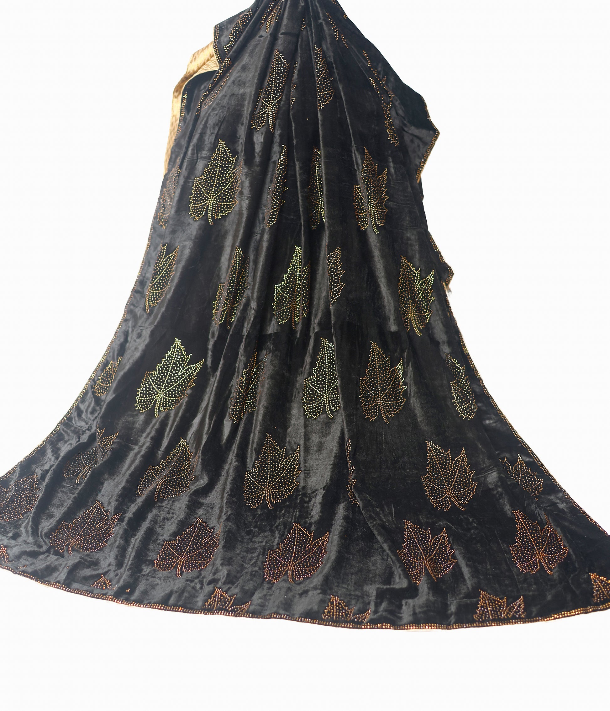 Description: A luxuriously soft velvet shawl adorned with same studded motifs and finished with elegant tassels — perfect for festive and formal wear.